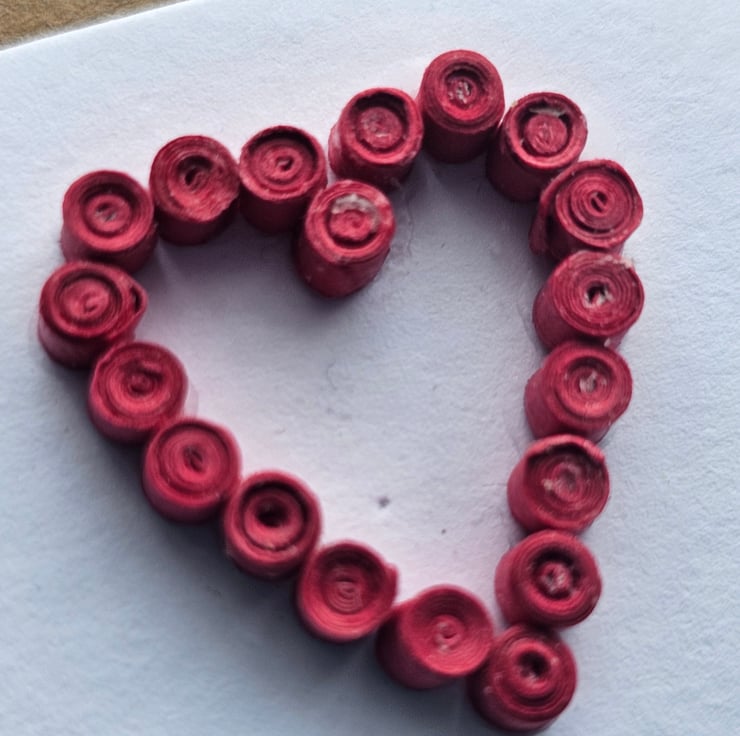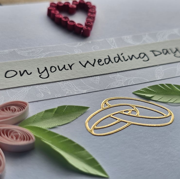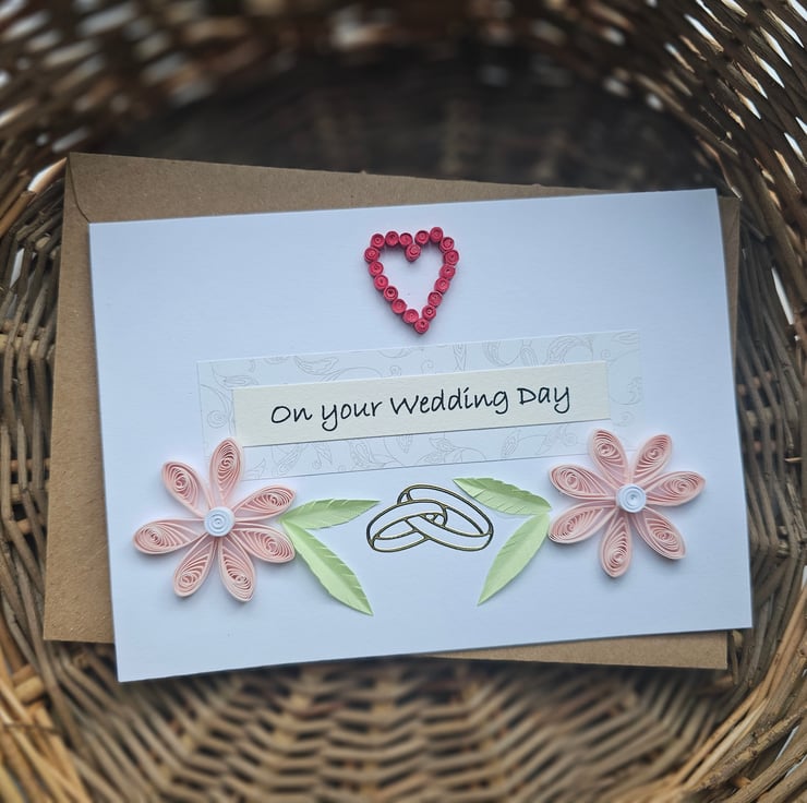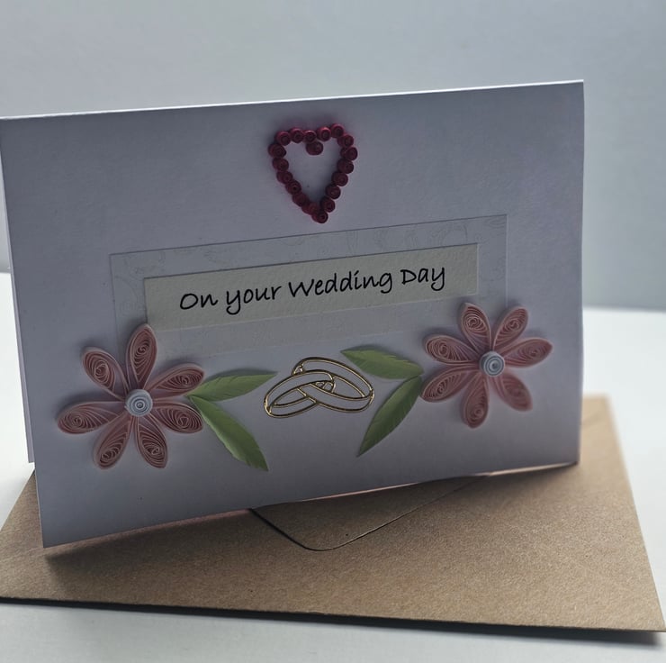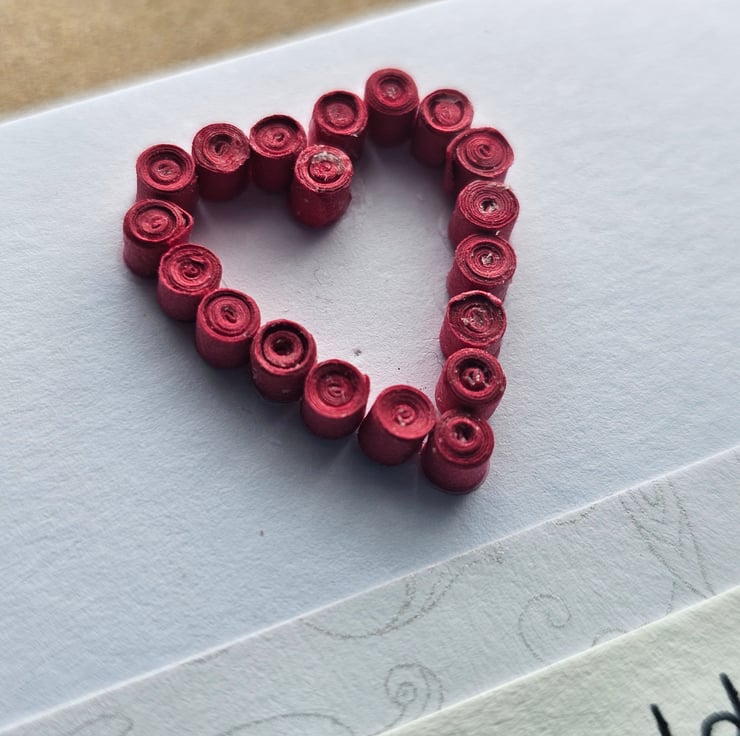 It is made using a white folded (tent-style) card, quilling paper and patterned paper. The heart is made of tight paper coils. It is finished with a gold wedding rings sticker. The greeting is printed on quality paper.