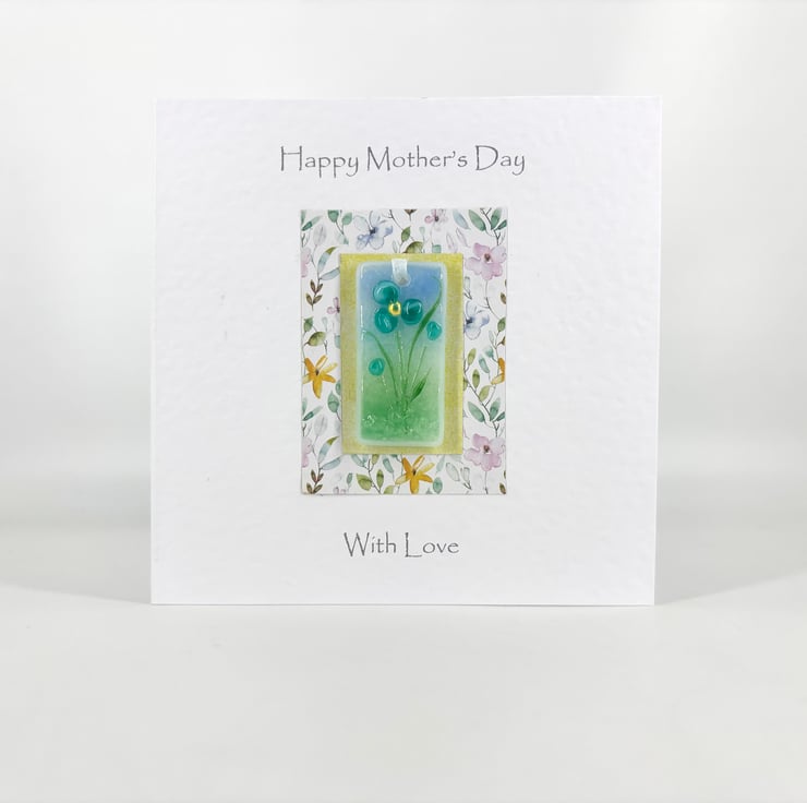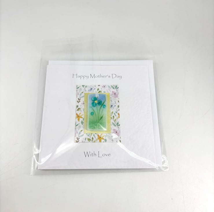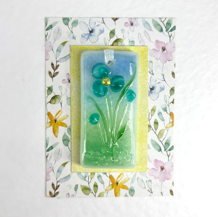 A lovely handmade card with a ‘mini meadow’ floral fused glass hanging attached to it - the perfect card and gift in one!