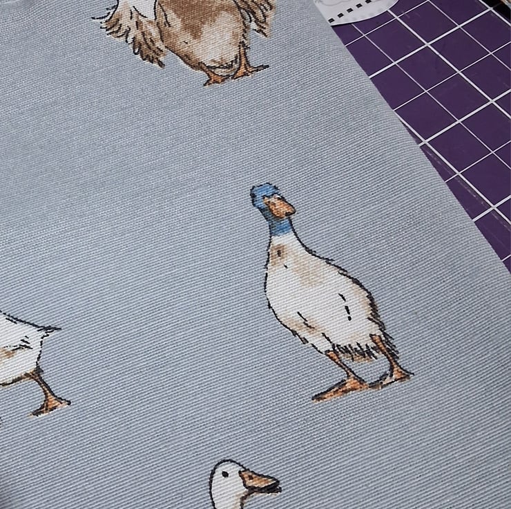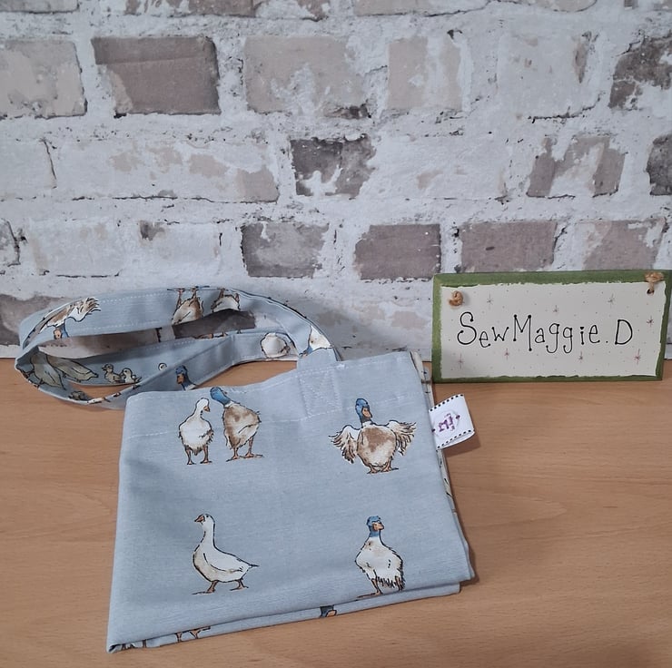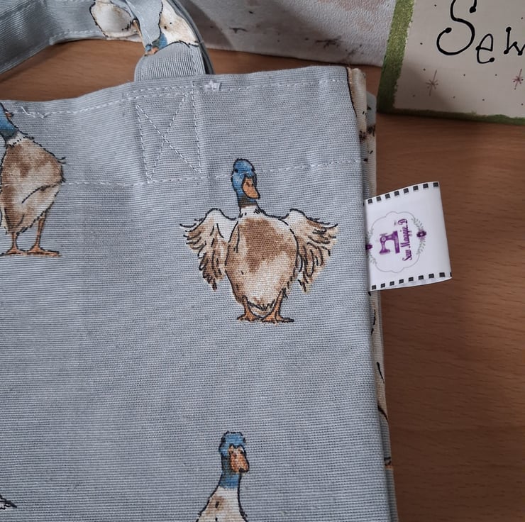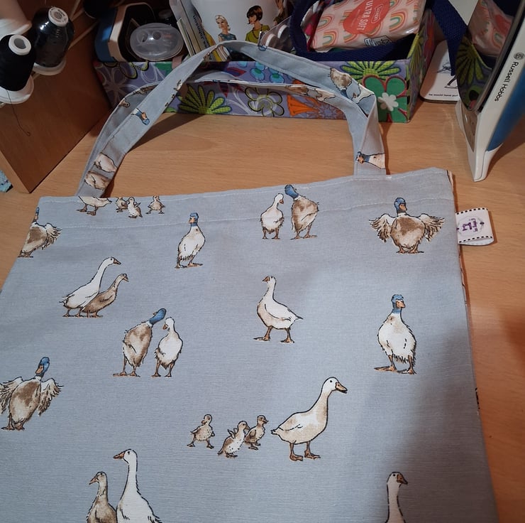This super cute ducks on blue tote bag is easy to fold up and carry in your handbag in case you end up buying more then you anticipated. A cute design with ducks and ducklings all over. I have reinforced the handles for more security. The bag is lightweight as it's unlined.