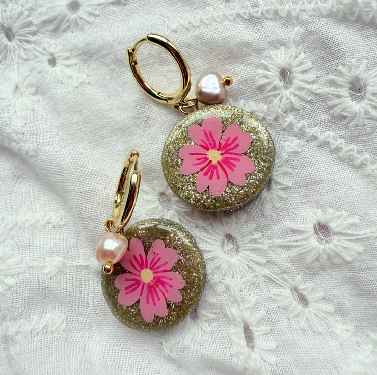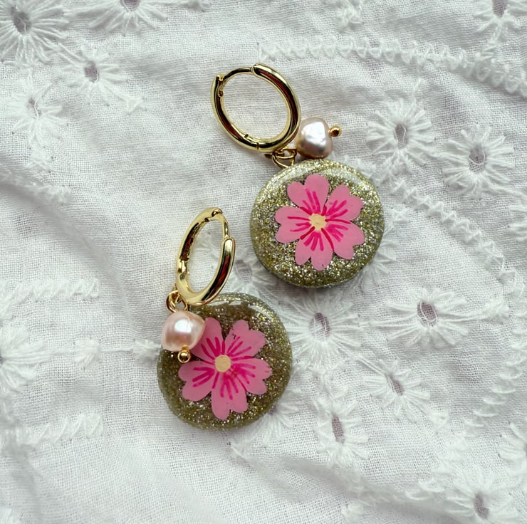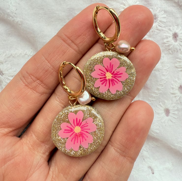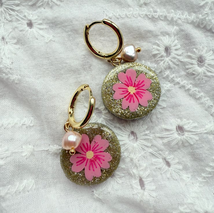 Pretty round glitter disc earrings made from Glitter polymer clay with hand painted Bright Pink Flowers. Fixed onto 18K Gold plated Huggie hoops with dainty little pearls.
