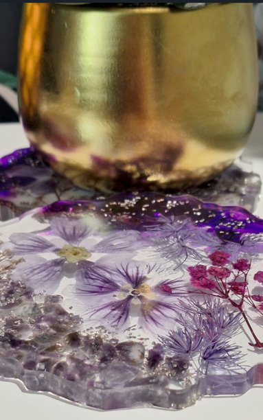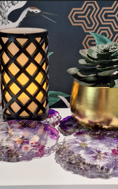 Heat resistance: Safe for warm mugs. To protect the clarity of the resin and the delicate botanical inside, avoid placing boiling hot items onto the surface without a moment's cooling. Contains crystals and hand pressed flowers. While these are sealed in high quality resin, they should be handled with care. Cleaning: Wipe with a soft, damp microfibre cloth. Do not use harsh chemicals, soak in water, or put in the dishwasher, as this can damage the coaster. Sunlight: To prevent the natural flower colours from fading, keep your coasters away from direct sunlight.