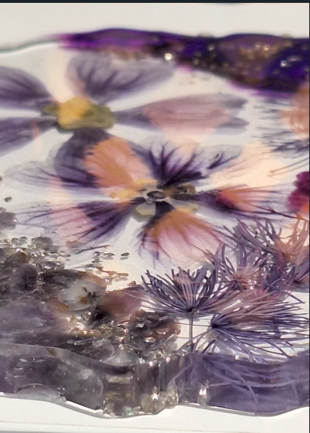 This set (originally commissioned as a special farewell gesture) is a perfect example of what NeuroBloom can create for you. It features delicate hand pressed purple florals layered with genuine amethyst chips and simmering silver broken glass with purple ink accents.