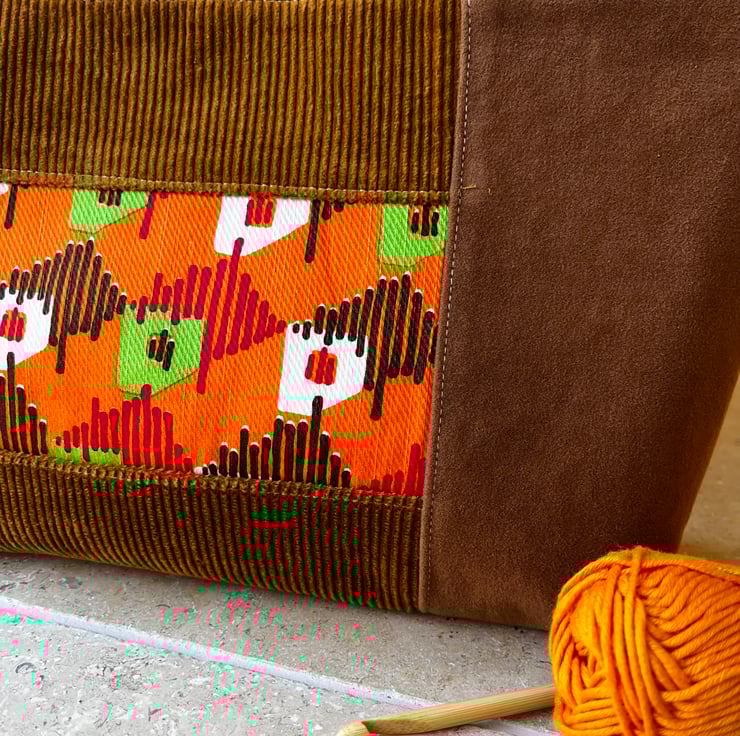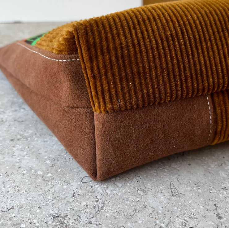 Featuring two panels of vibrant seventies printed fabric framed with brown and tan fabric from sample swatches including corduroy and velvety moleskin.