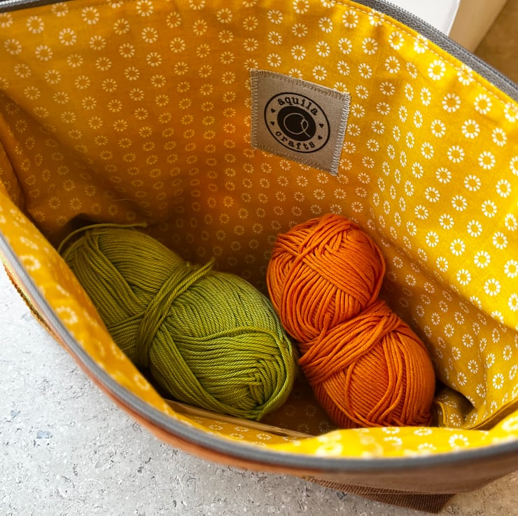 The bag is lined with pretty ochre floral cotton. This spacious pouch measures 27cm across the zip by 18cm tall. The bottom is boxed to give volume. There is a layer of interfacing to give structure. A strip of leather is tied to the zip pull. This can be swapped for ribbon on request.
