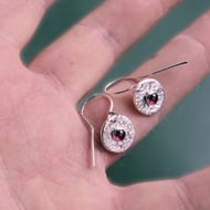 Reticulated disc heavily textured set with a 4 mm cabochon cut Garnet in a secure bezel set