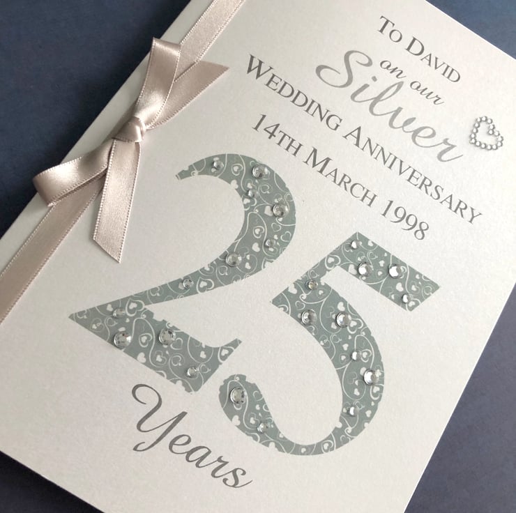A beautiful keepsake anniversary card for a Silver (25th) wedding anniversary. Hand crafted to order with the utmost care and attention.