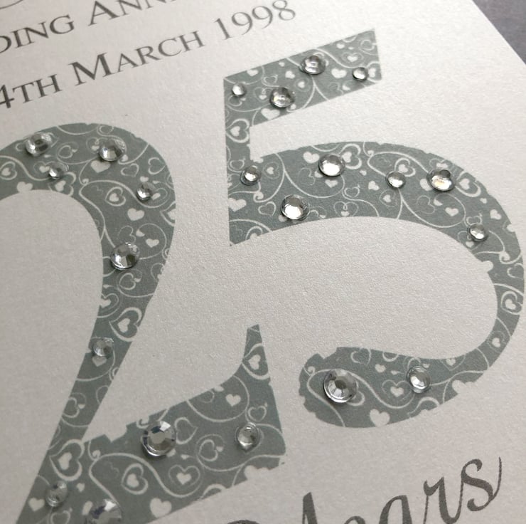 A shimmering greeting card featuring a romantic heart patterned ’25’ which is festooned with diamanté accents. The card is finished with a luxurious satin silver-grey colour ribbon bow. (Please note no real gemstones are used on the card)