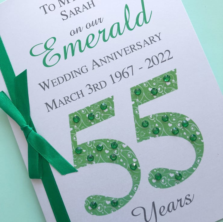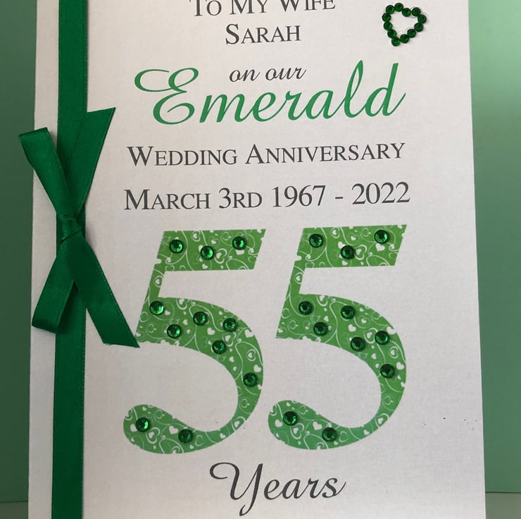 A beautiful keepsake anniversary card for an Emerald (55th) wedding anniversary. Hand crafted to order with the utmost care and attention.