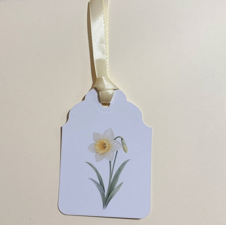Each tag showcases a soft watercolour daffodil illustration, symbolising hope, renewal and new beginnings. Finished with a satin ribbon tie, these elegant tags add a thoughtful, seasonal touch to gifts, bouquets or special occasions.