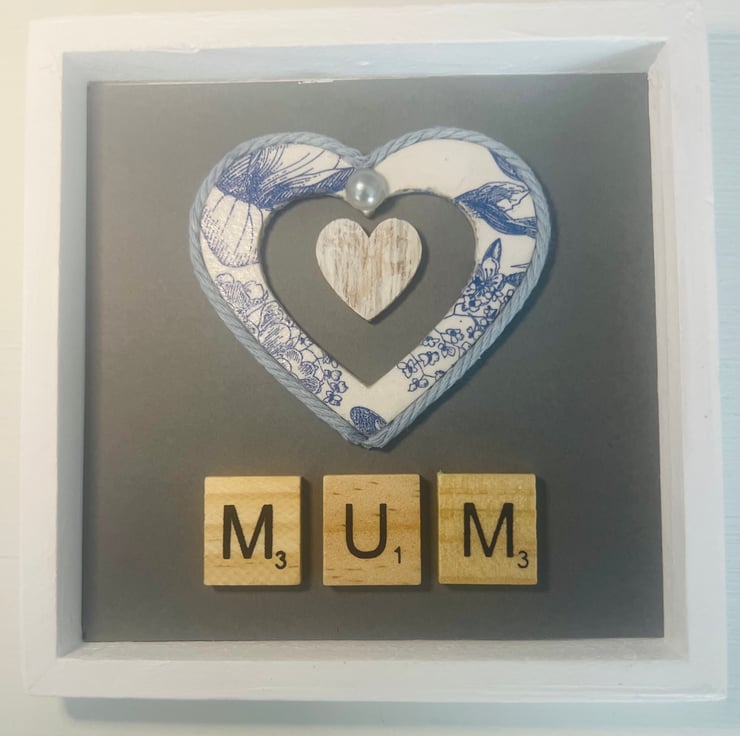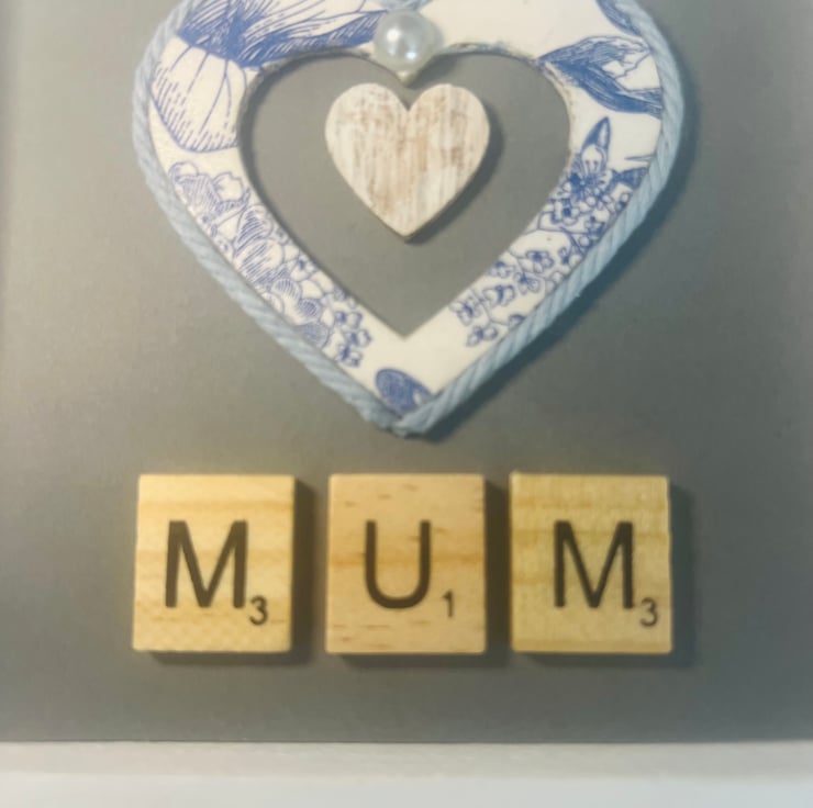 A beautifully handmade decoupage heart frame featuring a delicate blue floral design, layered heart detail and wooden “MUM” lettering.