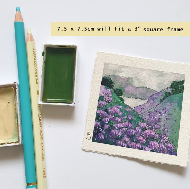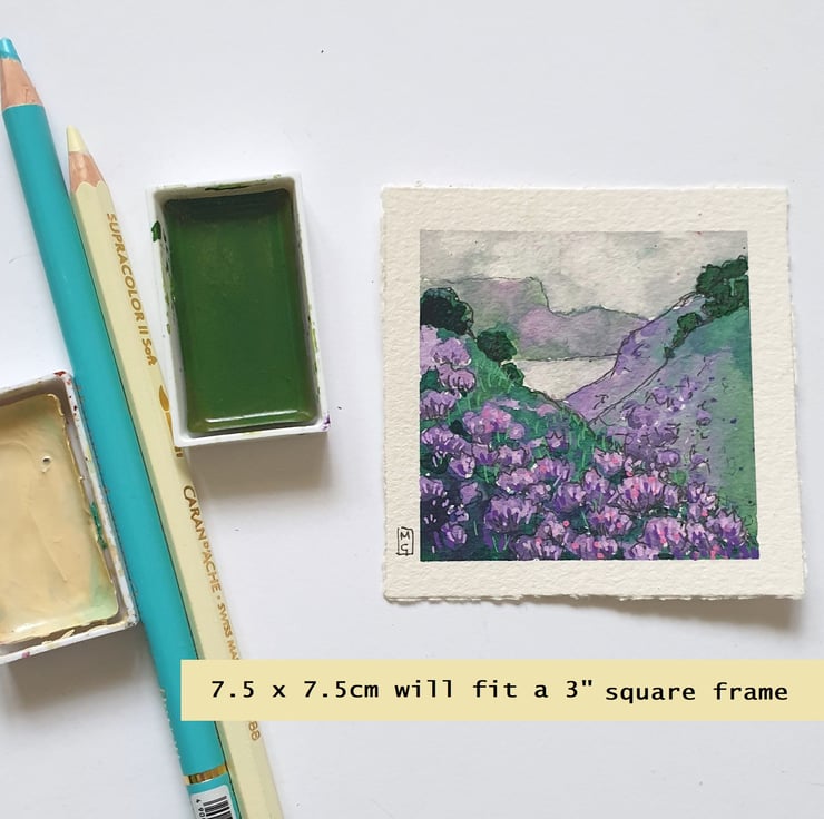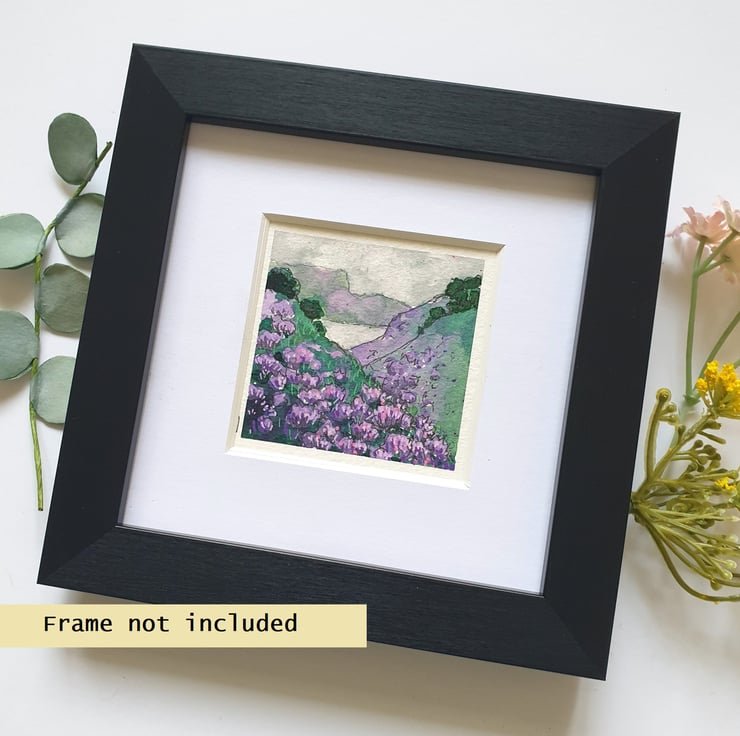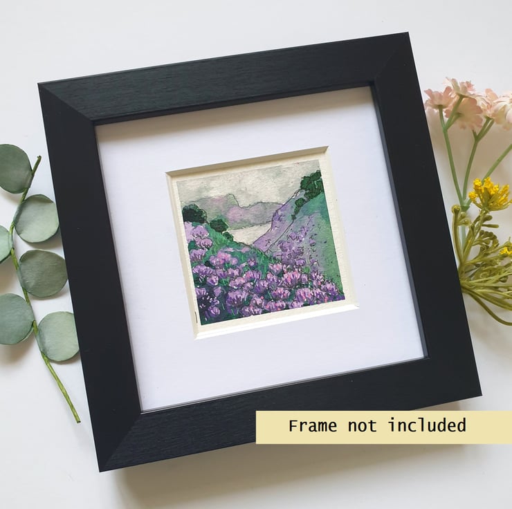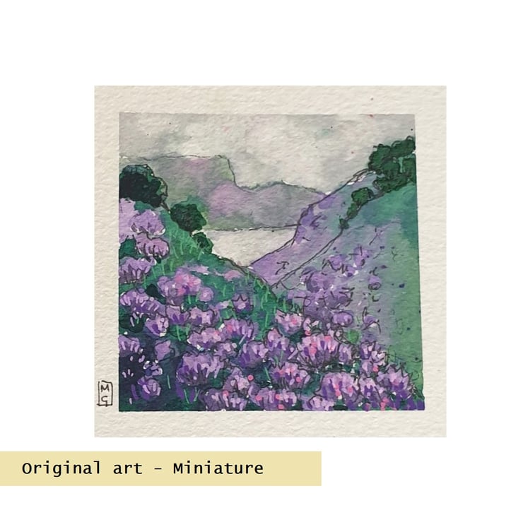 A tiny painting of Scottish highland hills covered with purple heather.