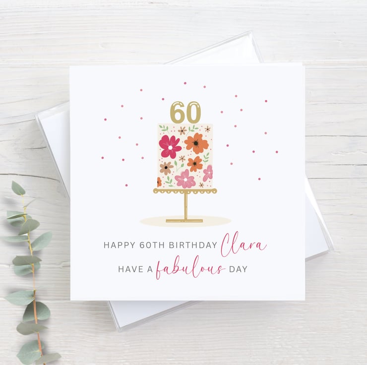 This personalised 60th birthday card features a unique hand drawn floral cake illustration on a gold stand. A lovely handmade milestone card that can be customised with any name for a special touch.