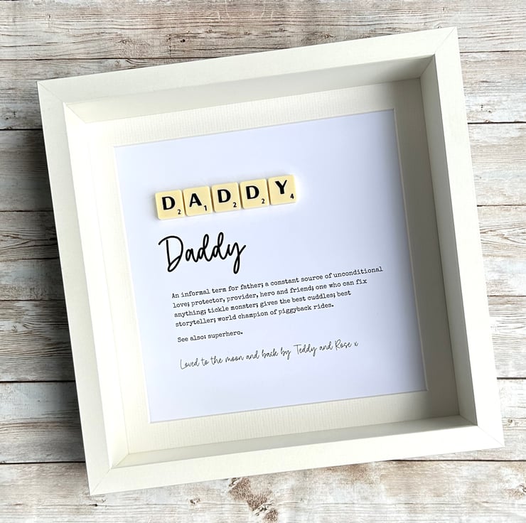 Spell out any name with the scrabble tiles, e.g. Papa, Pops etc at the top of the frame and then add your own personalised text to the bottom of the frame.