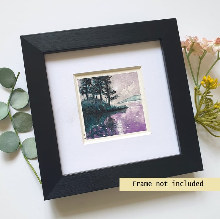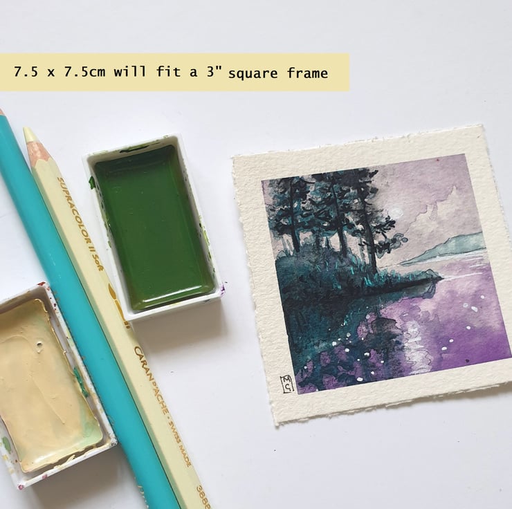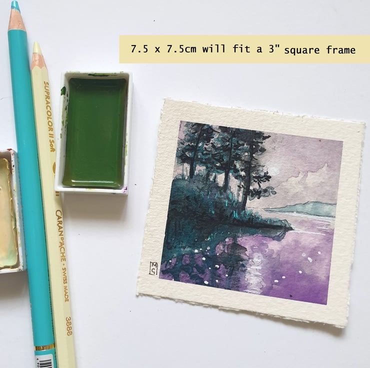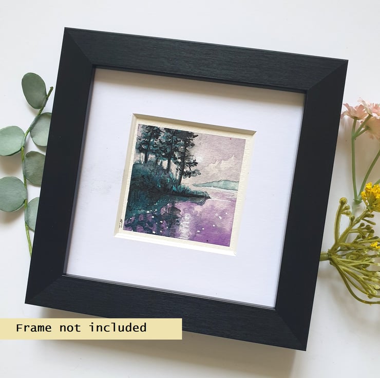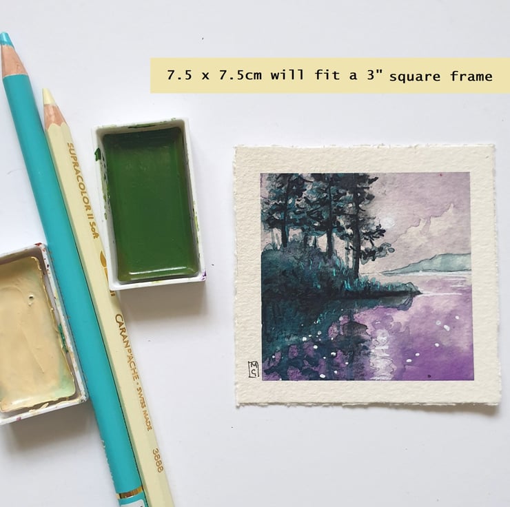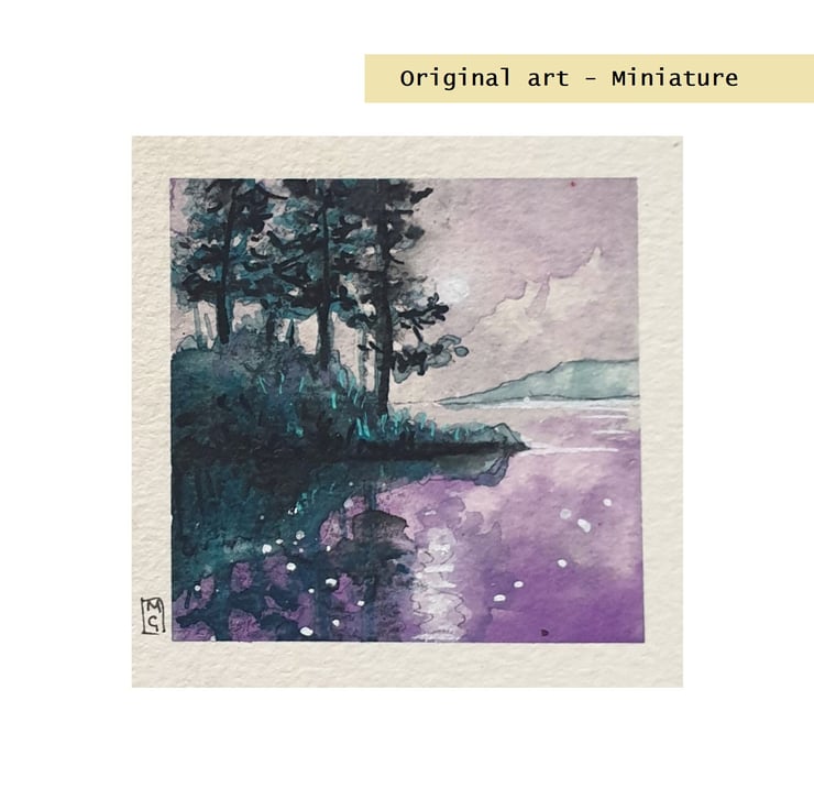 A tiny painting of a lake with a tree covered island and it's reflections on the water. The painting is an evening scene in greys and purple.