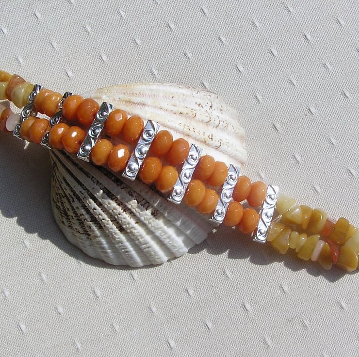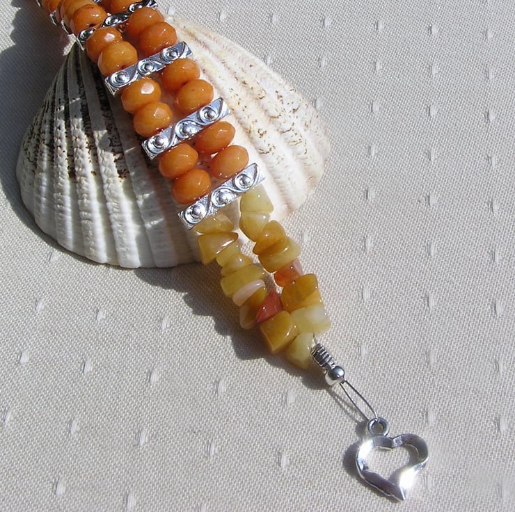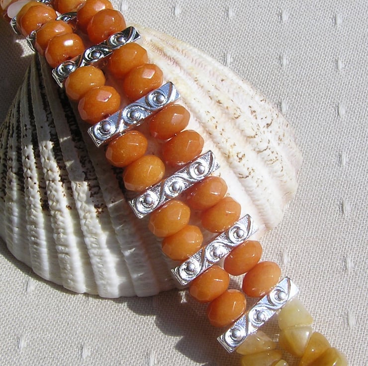 This Stunning Bracelet is made from wholly from Golden Jade... faceted rondelle beads and contrasting Gem-chips... each section separated by an ornately decorated Tibetan Silver Bar Spacer with a tiny Silver Heart at each end - a Beautiful Sunny combination that will look stunning either worn casually or with something more Elegant for a Special Evening out