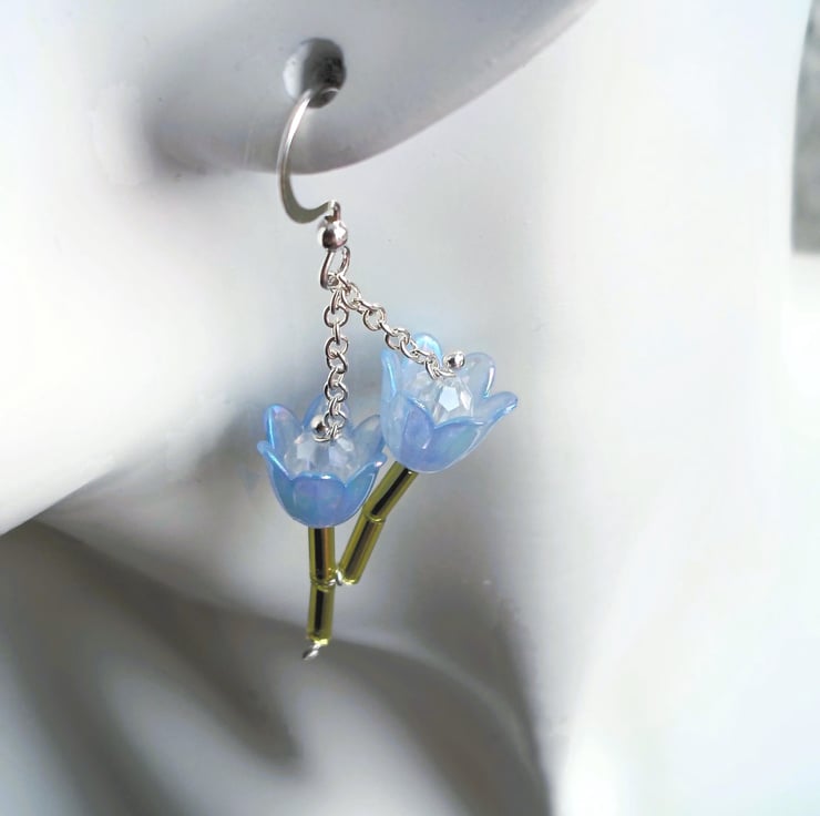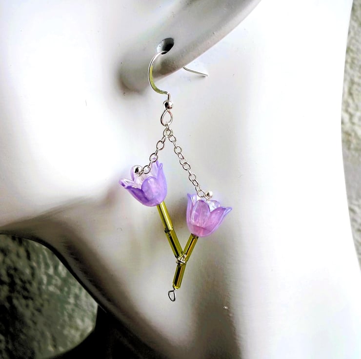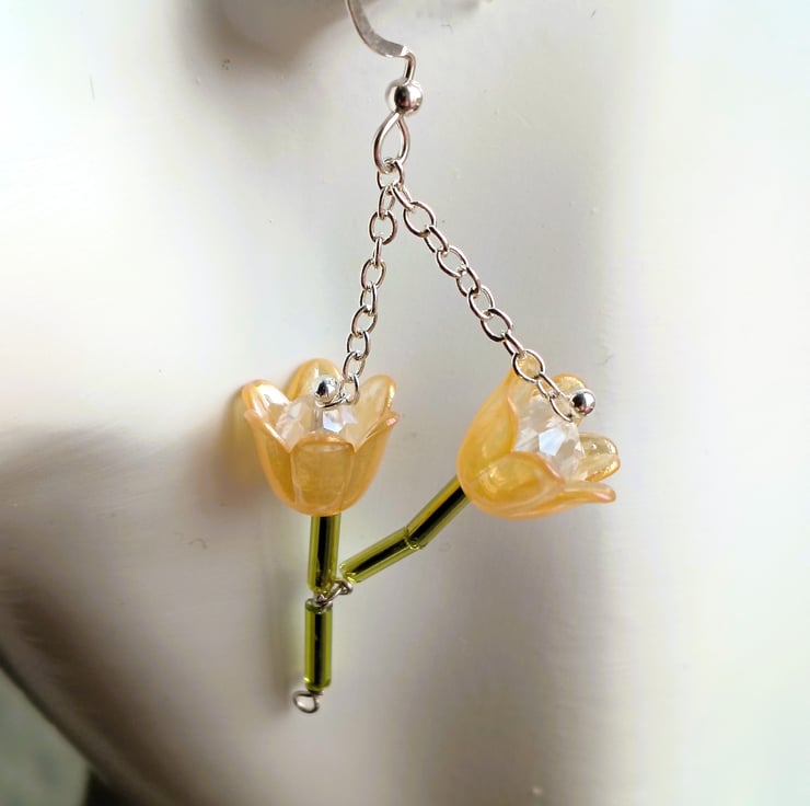 Each pair is lovingly made using delicate lucite bell flower beads, shimmering glass bugle beads and suspended from lightweight silver plated chain and ear wires. Comfortable to wear all day. Drop Length 55mm Width 22mm approx.