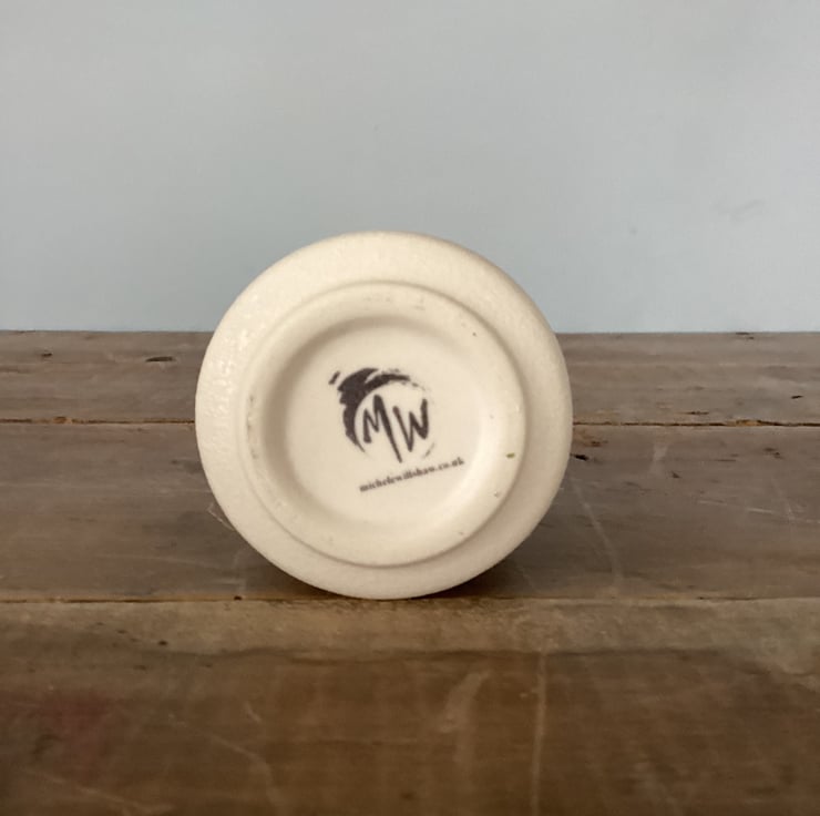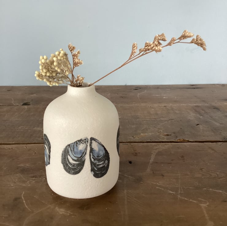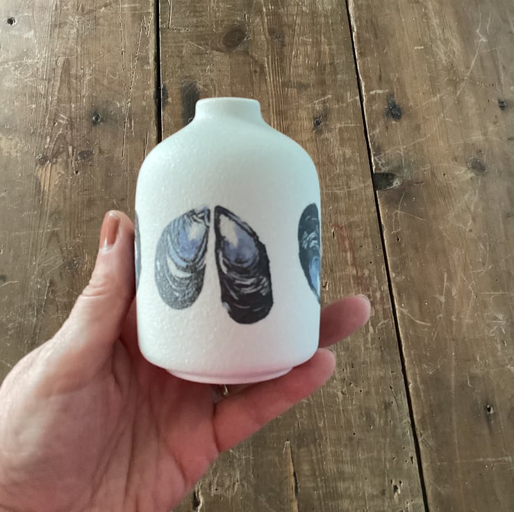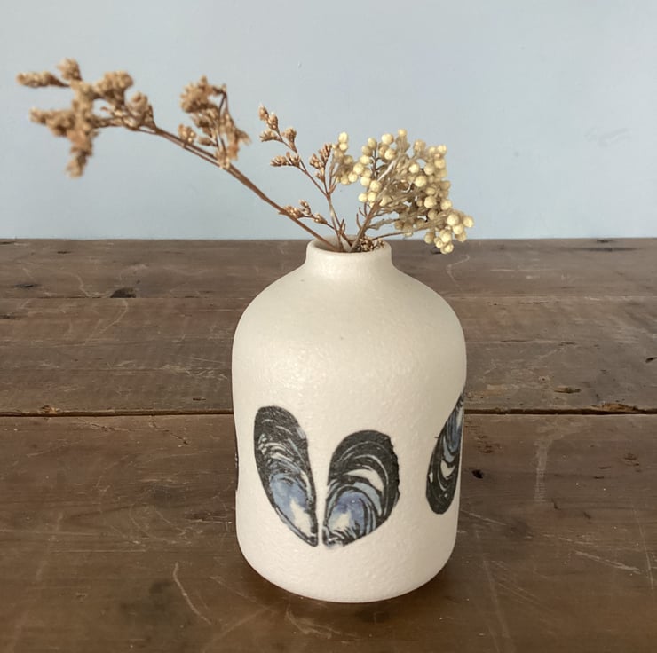 A small textured vase suitable for small posies. Decorated with a mussel shell design decals. As you can see from the photos, unfortunately, some of the decals have blown in the kiln. Perfectly functional, just perfectly imperfect to look at from some directions. However, if you turn it around, no-one would ever know!