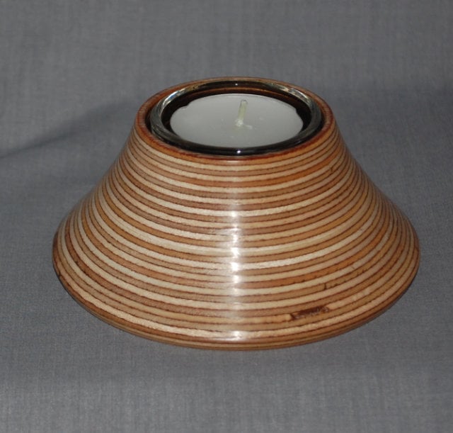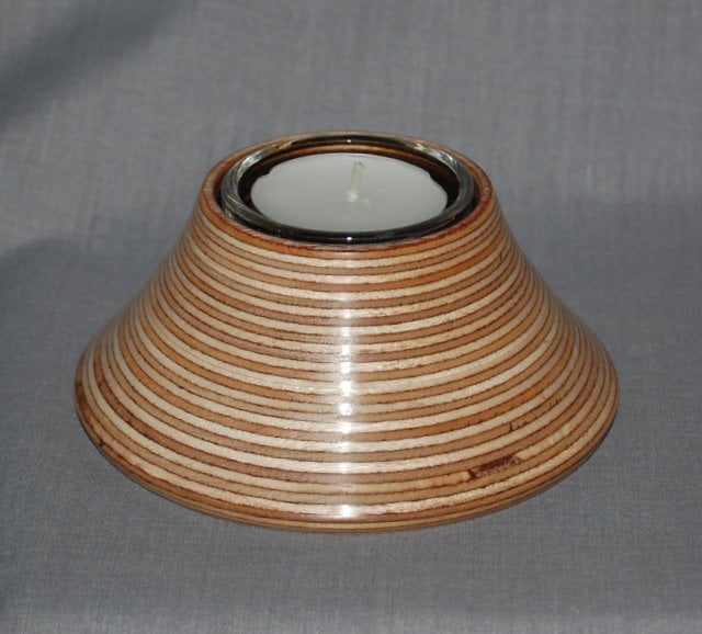 As we are having difficulties with sourcing the plywood used in our work this tealight is, for the moment, an “end of line”. Measuring approximately 11cm wide and 5cm high is comes with a glass liner and one tea light.
