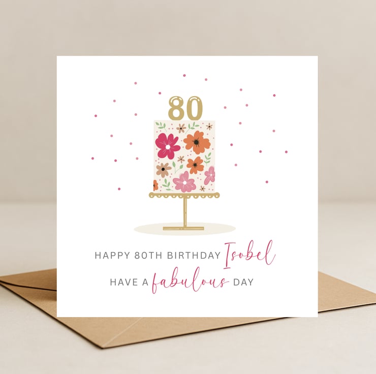 A special personalised 80th birthday card featuring a unique hand drawn floral cake illustration on a gold stand with a number 80 cake topper. A lovely handmade milestone card that can be customised with any name making it a truly special touch.