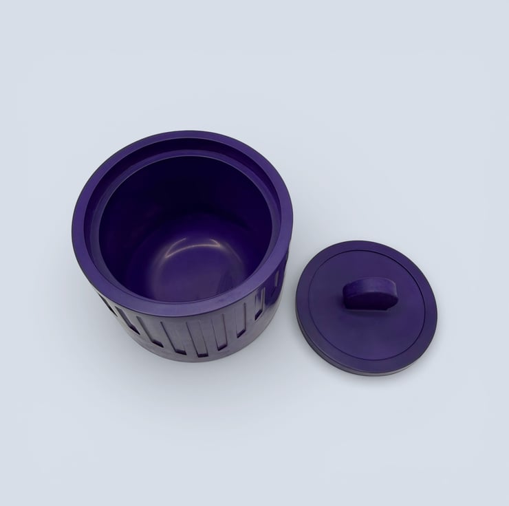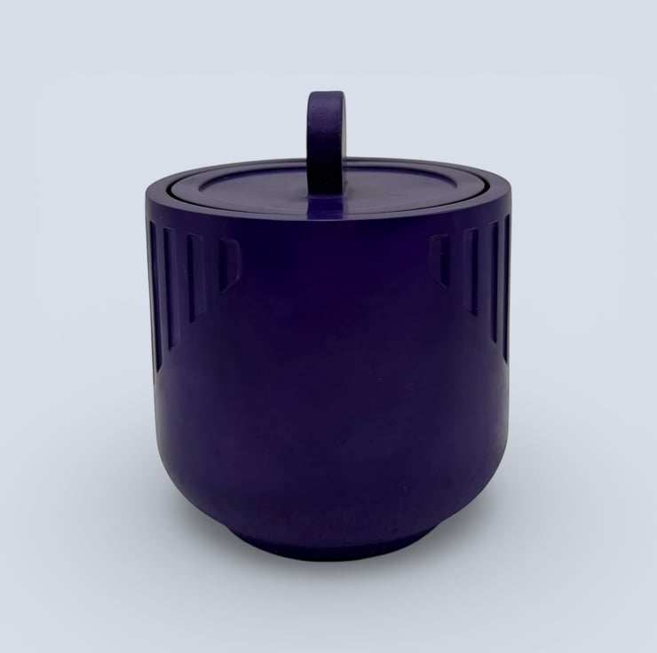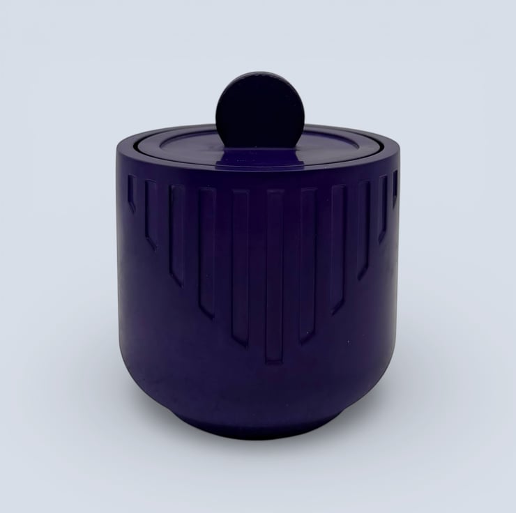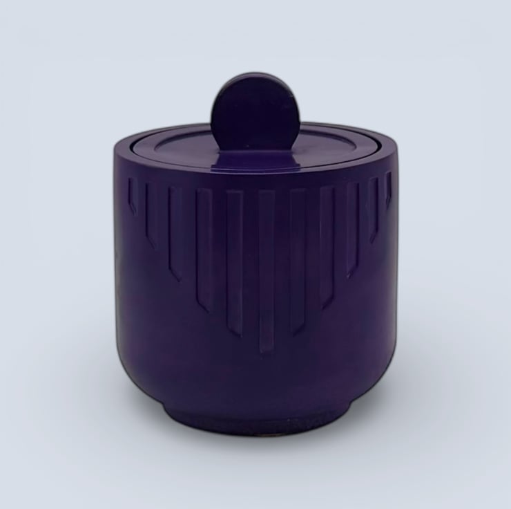 Midnight violet jewellery box with lid in a modern round shape, designed as a stylish storage piece for rings, earrings and small keepsakes. This bold yet refined jewellery box features subtle vertical grooves arranged in an inverted triangle detail on the front and back, adding quiet architectural interest. The deep midnight violet tone brings rich, inky depth to contemporary, Scandinavian and minimalist interiors, and makes a thoughtful gift for birthdays, housewarmings or special occasions.