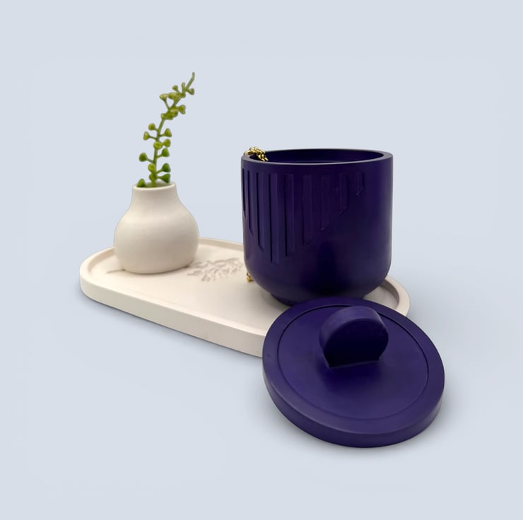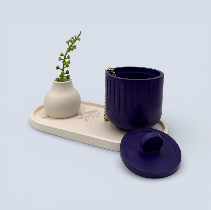 Each box is handmade from a water-based mineral material with a smooth, stone-like feel. The exterior has been sealed and polished with two coats of plant-based wax sealer to enhance the finish. Cork pads are attached to the base to help protect surfaces. Small air bubbles and slight variations in shade are part of the handmade process and add to the individuality of each piece. Please note that screen settings may cause colours to appear slightly different in person.