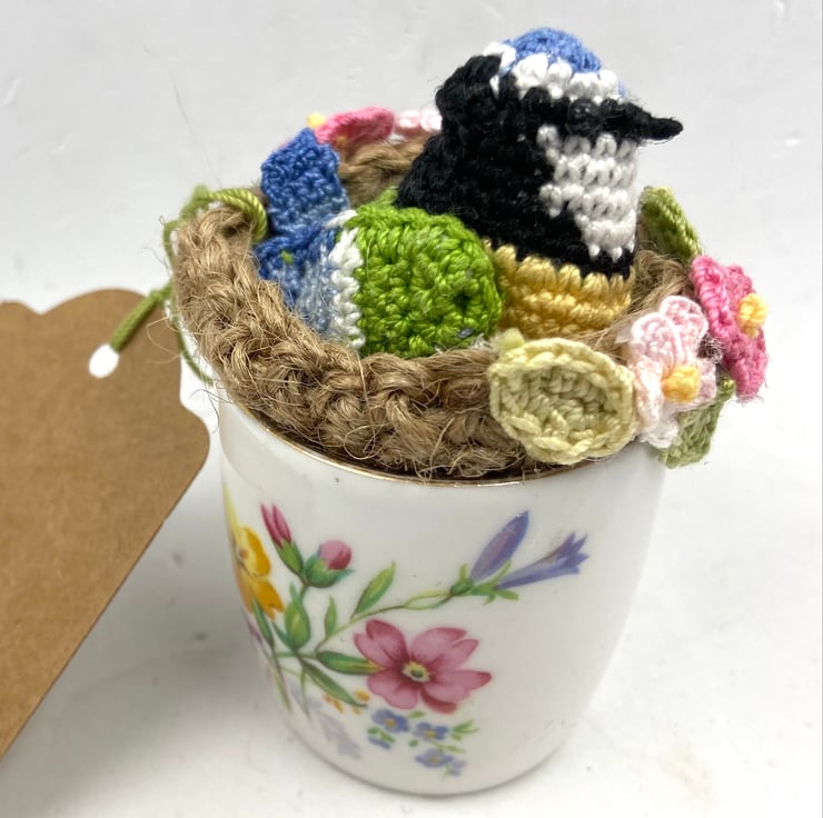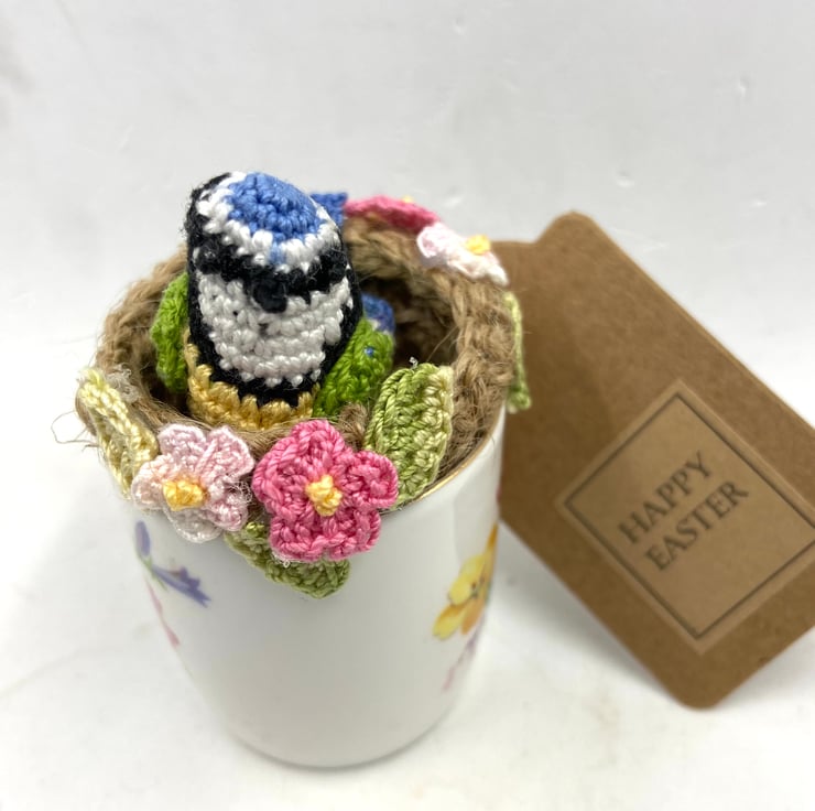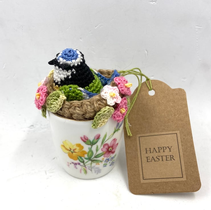 It sits in a crocheted jute nest which is decorated with tiny blossoms and leaves. The best sits in a pretty repurposed vintage china egg cup. The whole decoration measures approximately 8cm in height and comes to you in a pretty repurposed box. The tag reads Happy Easter, although I am very happy to exchange this tag for one with wording of your choice.