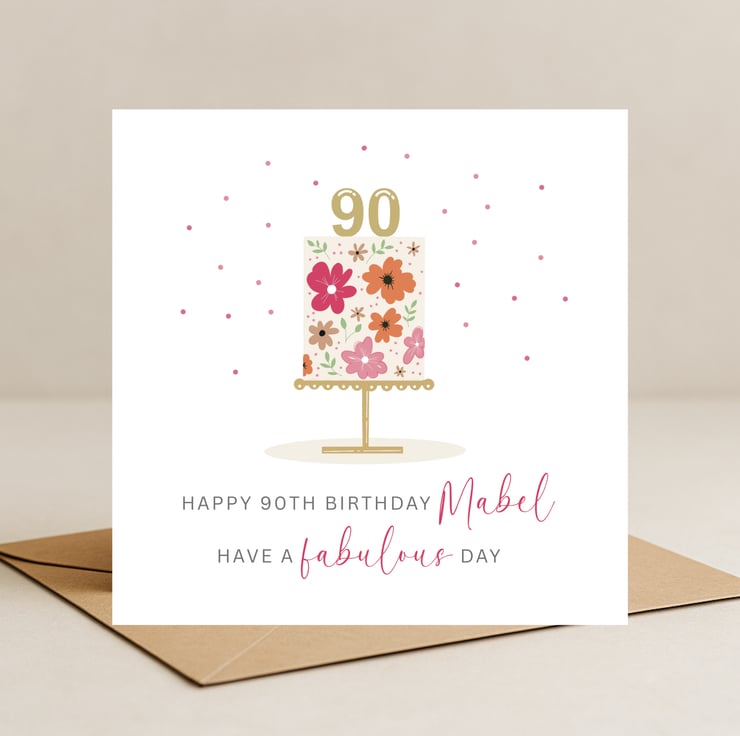 This personalised 90th birthday card features a unique, hand drawn floral cake on a gold stand and 90 cake topper. It is a beautiful handmade milestone card that can be customised with any name for a truly special touch.