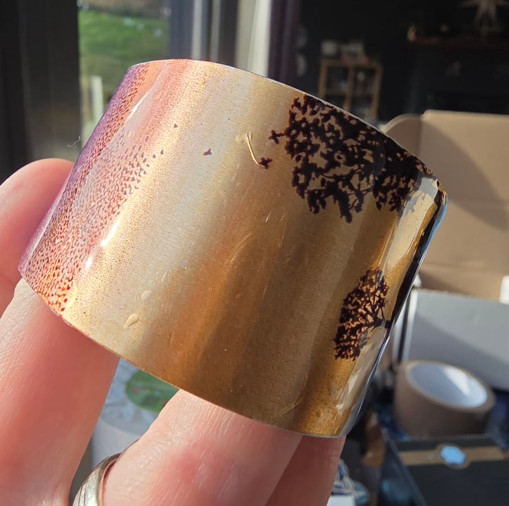 38mm wide aluminium cuff printed with a slice of an original artwork by Hannah MacIver. Sealed in uv resin.