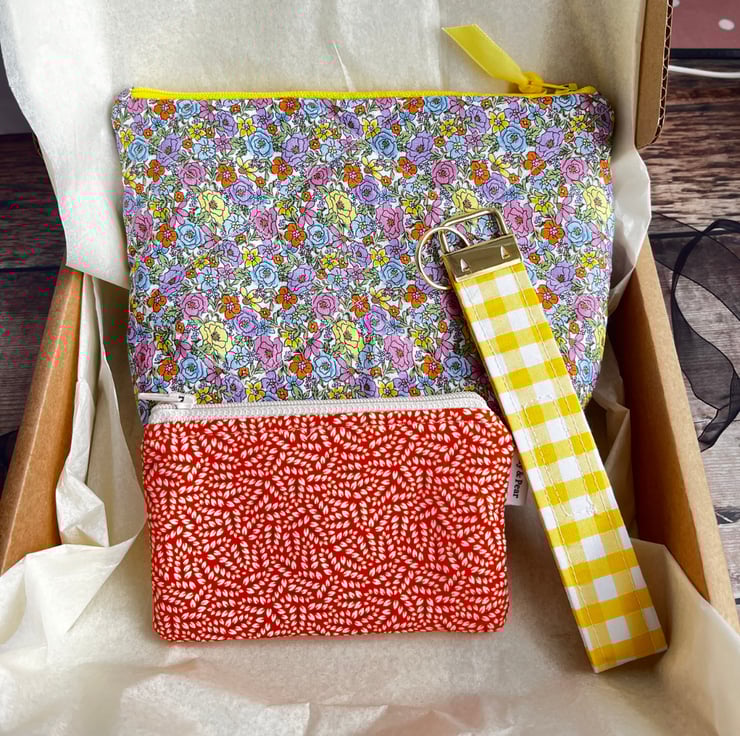 A collection of zipper pouches which you can use for a variety of things. This gift box comes with a small zipper pouch/purse a middle sized quilted zipper pouch/makeup bag and a useful key wristlet which can be attached to either bag.