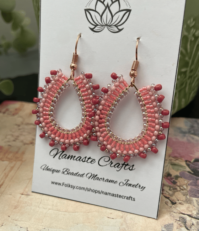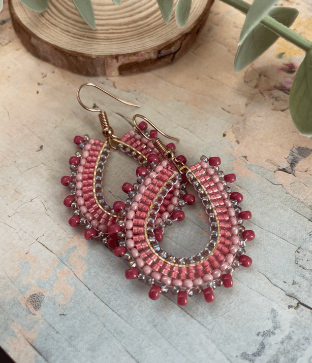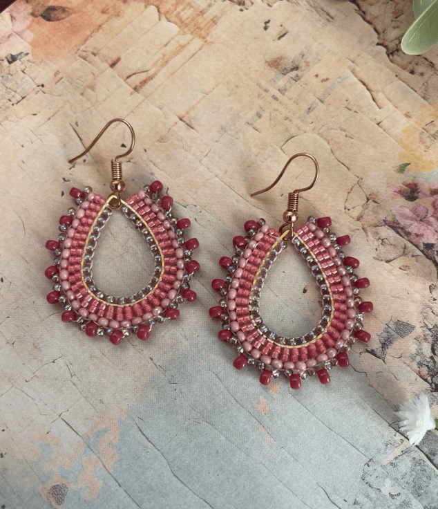 Parallel rows of Czech glass seed beads have been hand woven to outline the silver teardrop shape creating a beautiful pair of earrings that encompasses handcrafted, one-of-a-kind beauty ready to gift to that special person or to keep.