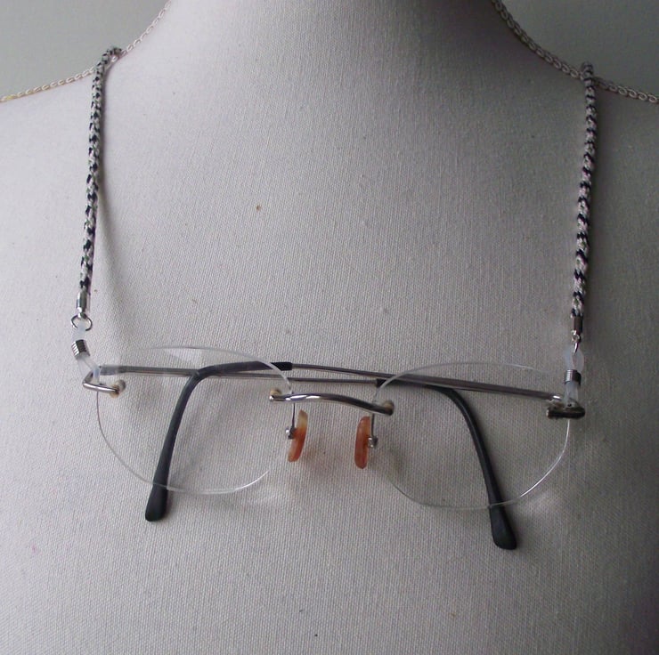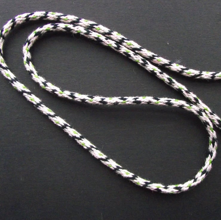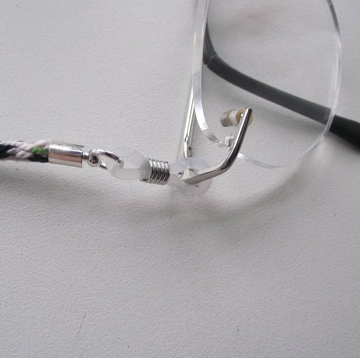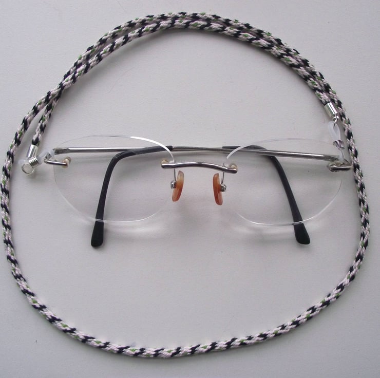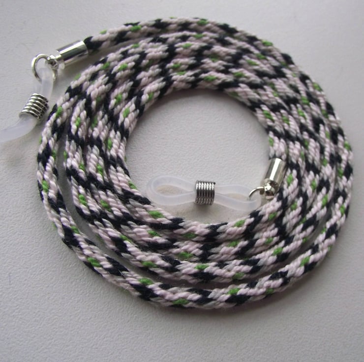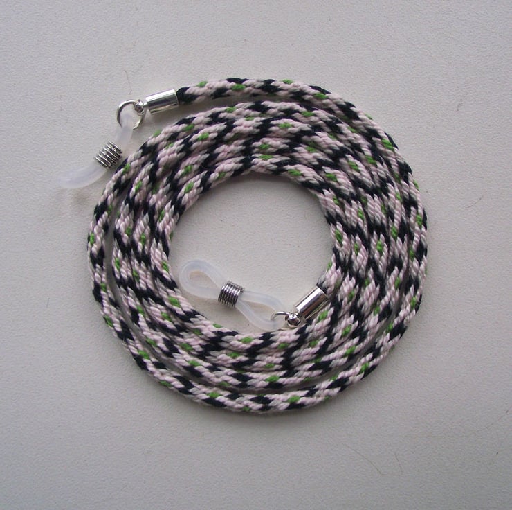 I made this strap or cord for glasses or spectacles, by using the Japanese Kumihimo braiding technique, using soft, high quality cotton threads. The colours are pale pink, green and black. There are white loops attached to silver coloured findings which easily slip onto the arms of glasses.