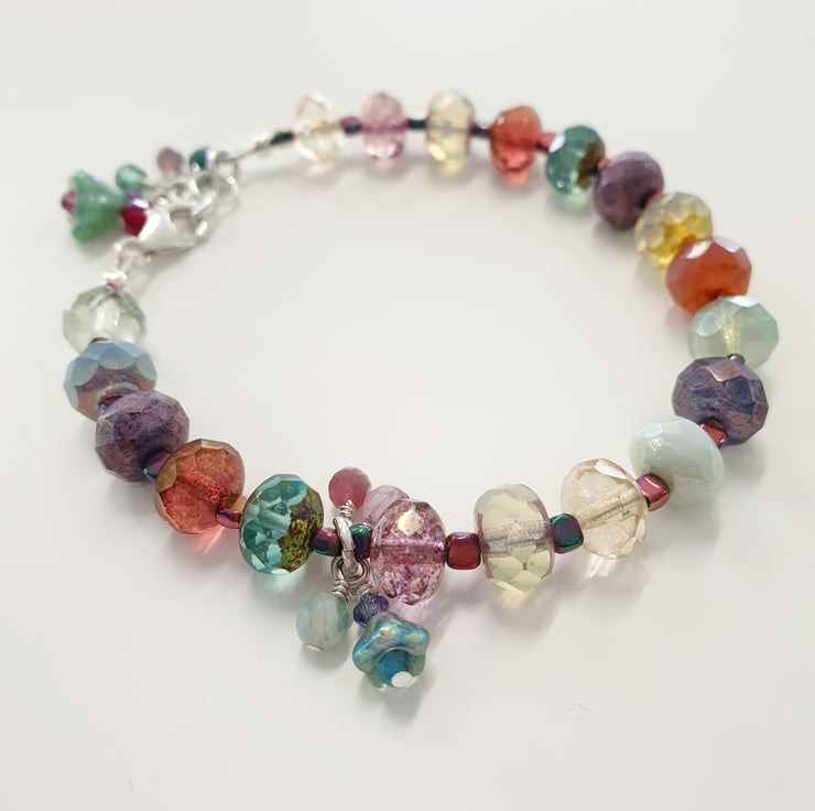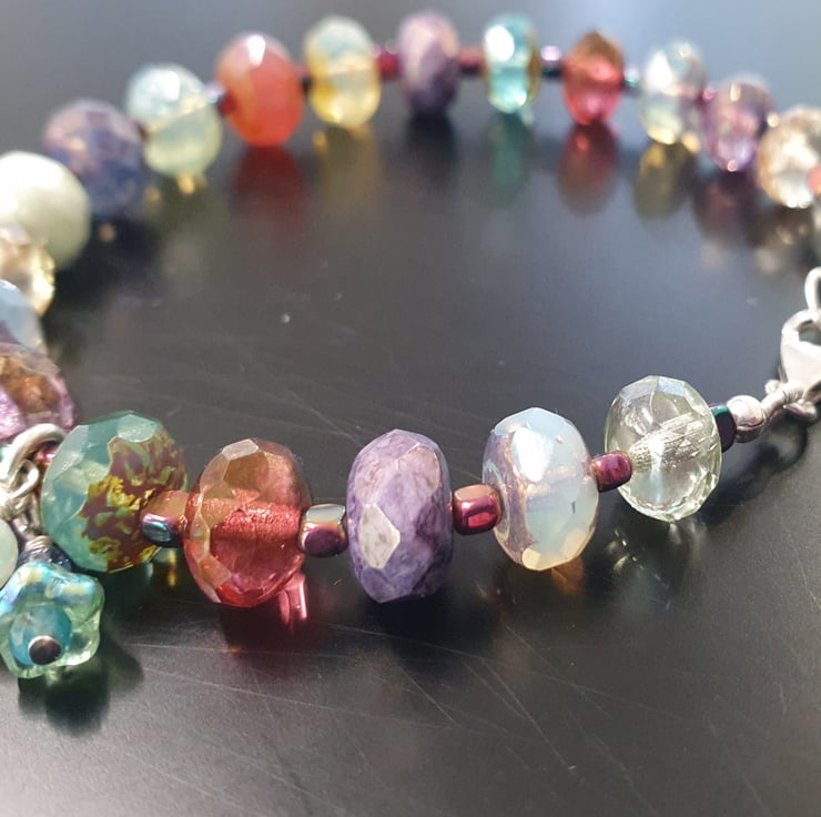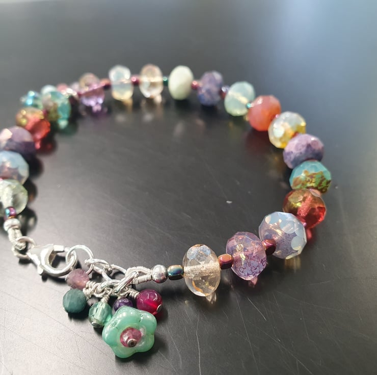 This pretty bracelet is one of a kind and created with stunning Czech glass iridescent coloured rondelles, Hematite rainbow spacers and sterling silver.
