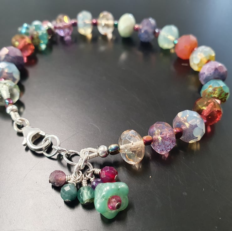 I have added a glass flower bead with pink quartz centre and some hand wrapped Tourmaline beads . More little Tourmaline dangles and a smaller flower sit along the bracelet. The clasp, pins and findings are all sterling silver