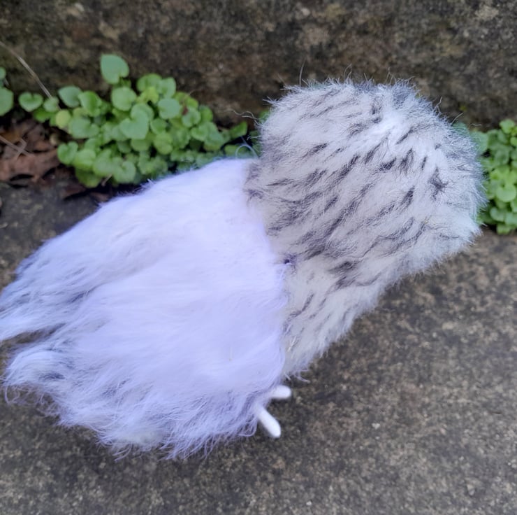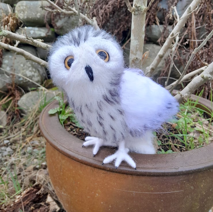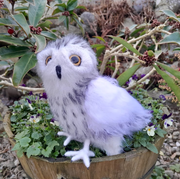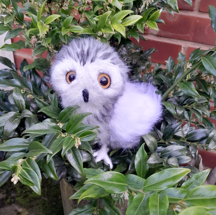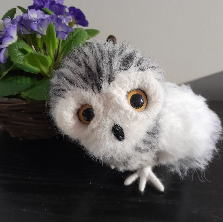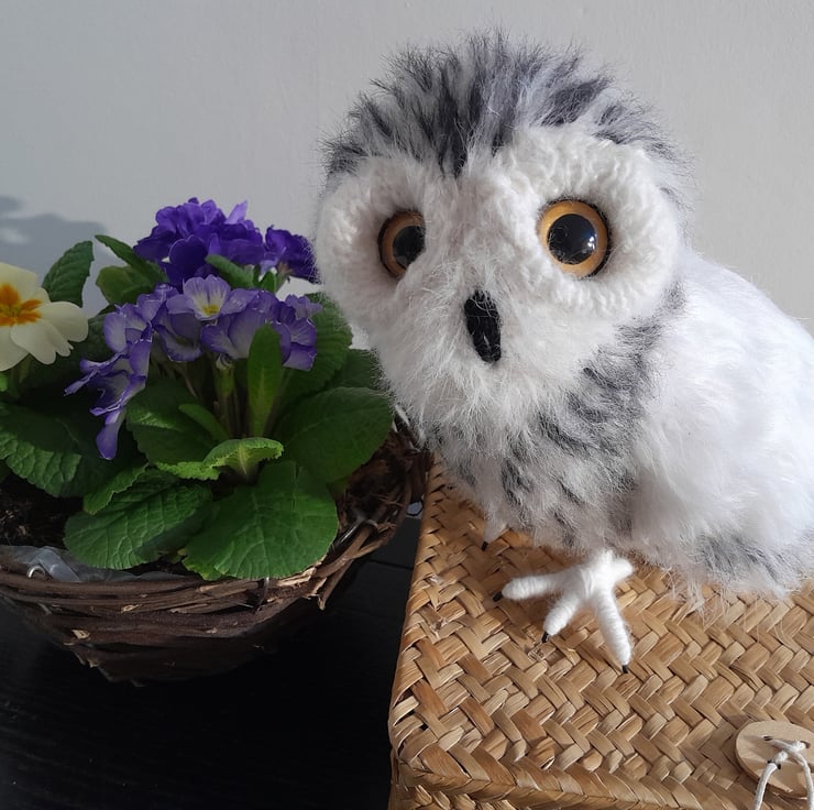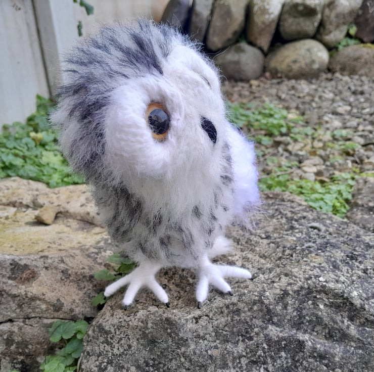 My little owl is knitted in white alpaca yarn and mohair. His wings in a faux fur yarn. All his black markers are embroidered on completion. He is filled with a heavy stuffing to give him a good balance weight. He stands on his impressive talons which are secured well but allow movement for positioning. My little owl is designed to stand in a typical owl manner when looking for prey with those impressive large round eyes.
