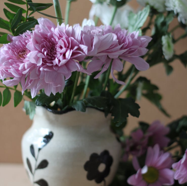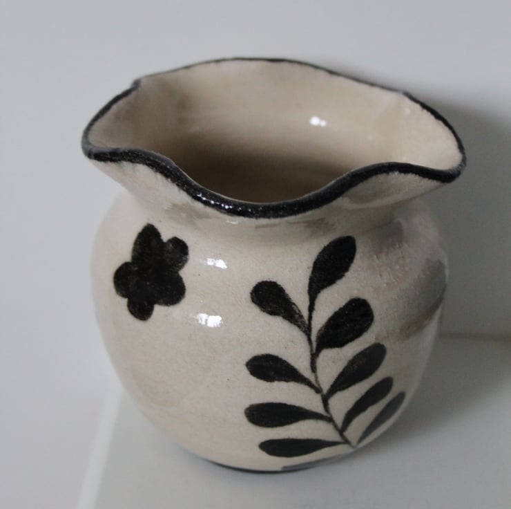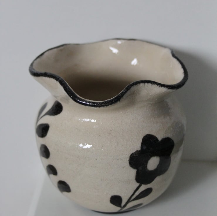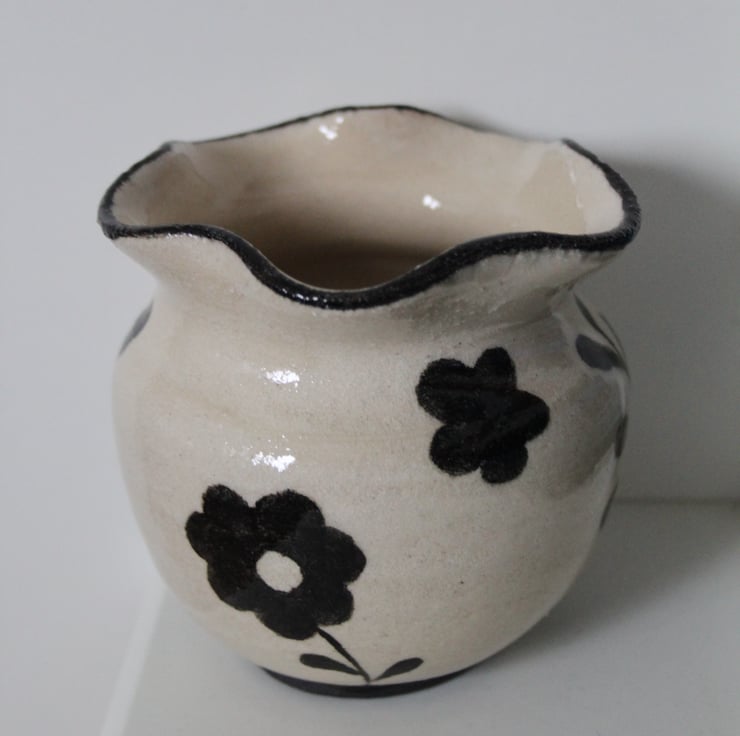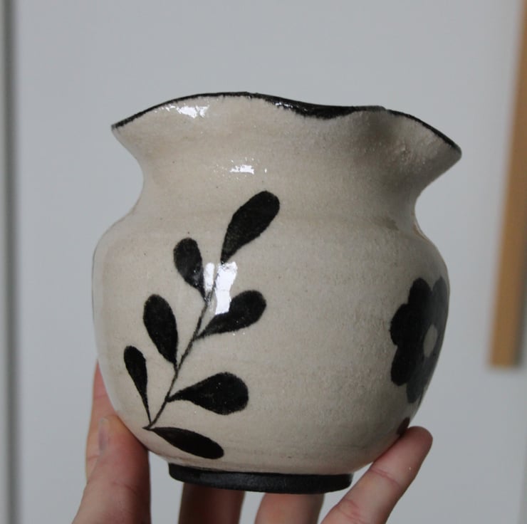 Ceramic vase thrown on the wheel and hand-painted. Fired to c1200 degrees (stoneware temperature) which makes things more durable than earthenware.
