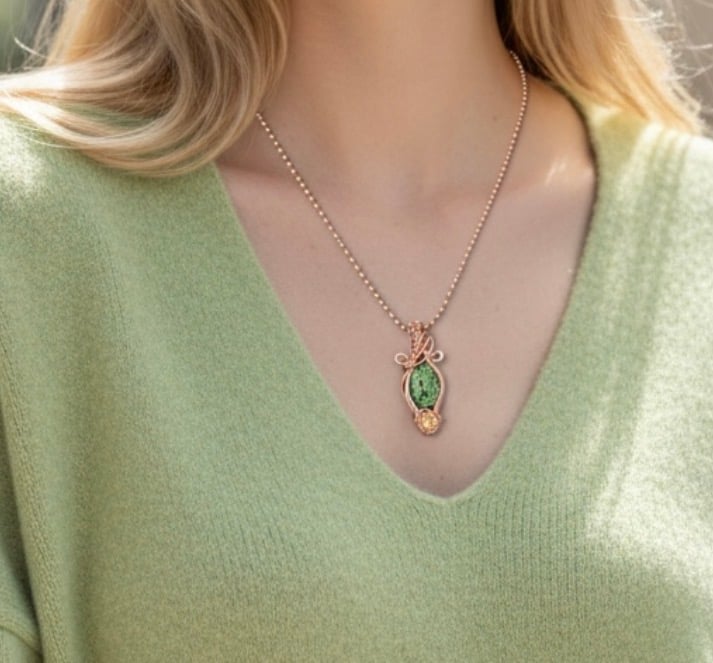 I have made this pendant using solid bare copper. The pendant wire wrap design features a beautiful vibrant semi precious Zoisite cabochon stone and a beautiful faceted sparkling crystal. The pendant is attached to a copper ball chain 18”.