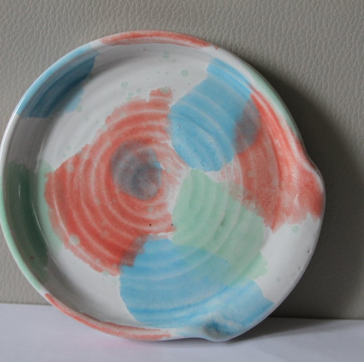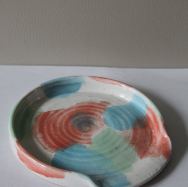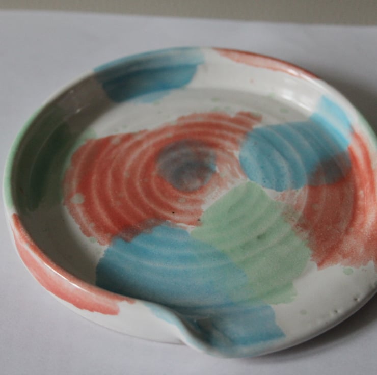 Wheel thrown spoon rest with a slightly dropped lip on one side where your spoon handle rests. It's glazed in a multicoloured organic design and fired to c1200 degrees (stoneware temperature) which makes things more durable than earthenware.