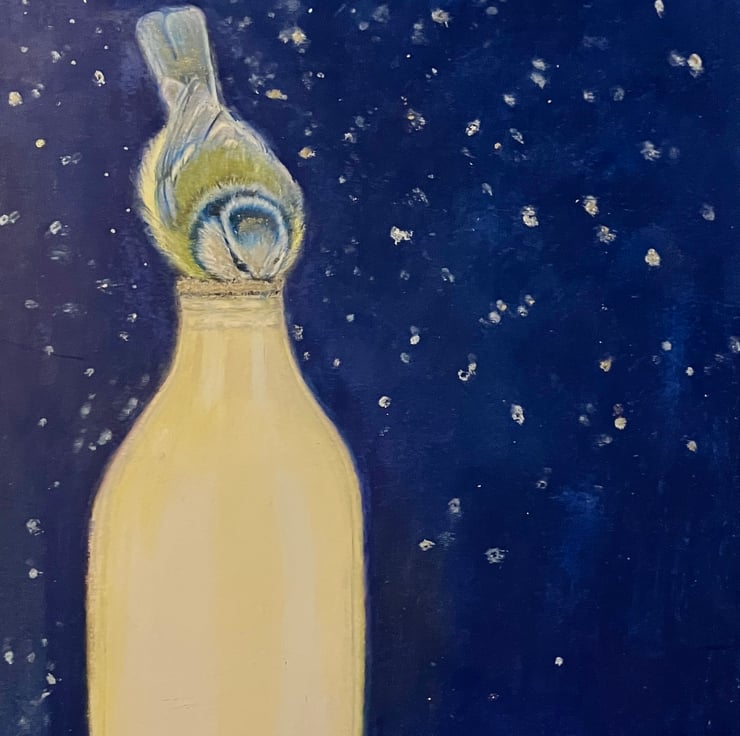 This is a perfectly imperfect original coloured pencil drawing of a blue tit drinking the cream from a milk bottle that has been delivered early in the morning by the milkman.