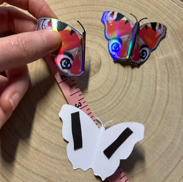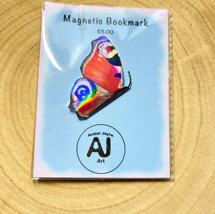 Stunning mini butterfly magnetic bookmarks, featuring a holographic peacock butterfly.The design has been hand-drawn in Procreate, using an Apple Pencil and iPad.