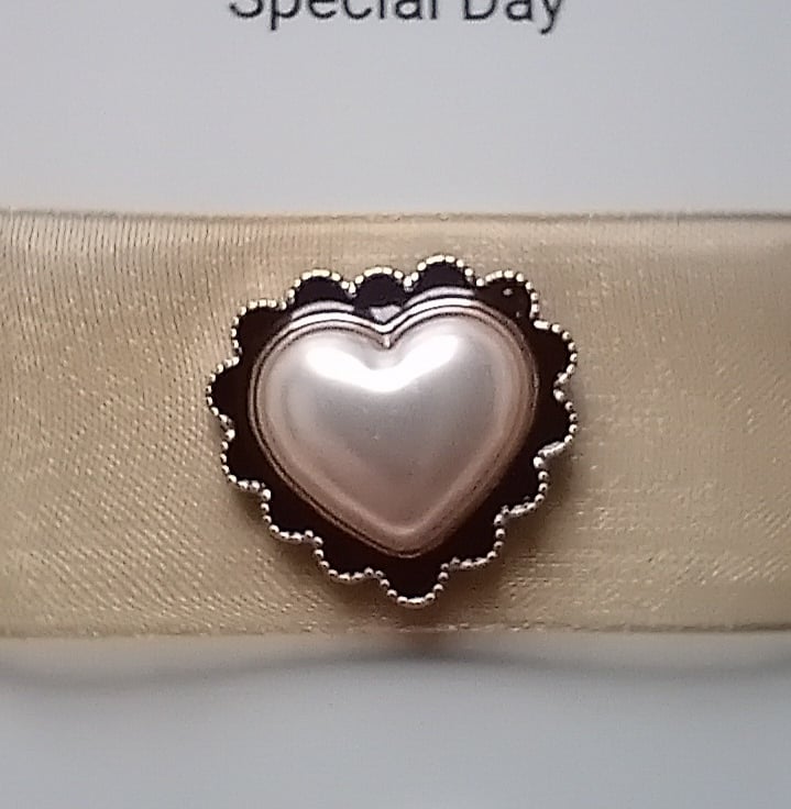 A pearl heart with black edging set on gold ribbon.