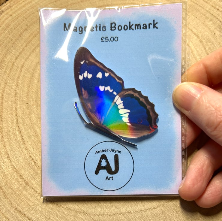 Beautiful magnetic bookmark, featuring a purple emperor butterfly! It has been hand drawn using an Apple Pencil and an iPad, and looks stunning with rainbow holographic wings.