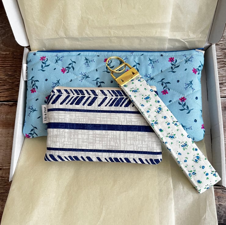 In addition, you will receive a small zipper pouch perfect for keeping your store card and coins safe. Finally you will get a pretty blue floral patterned wristlet to hold your house or car keys. You can attach your wristlet to a handbag or your zipper bags.