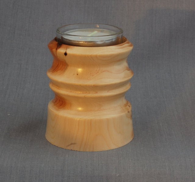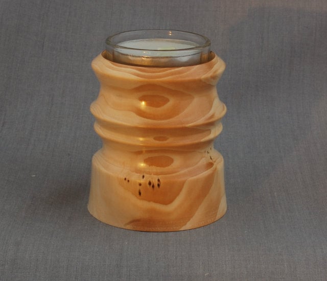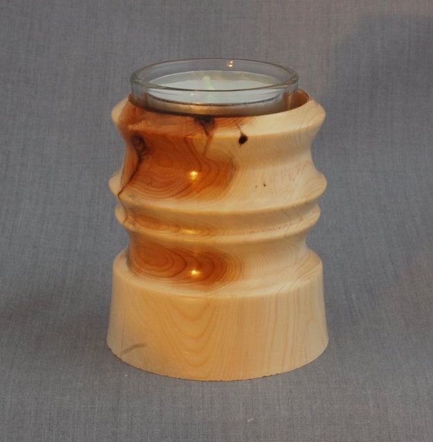 This attractive tealight, highlighting the cream of the outer wood, tiny black specks of incipient branches, combined with the rose of heart wood has, sadly, developed a small crack on one side. It measures approximately 6.75 cm high and 8 wide at the base. This attractive tea light holder comes with a glass liner to protect the wood and one tea light. This tea light has been discontinued.
