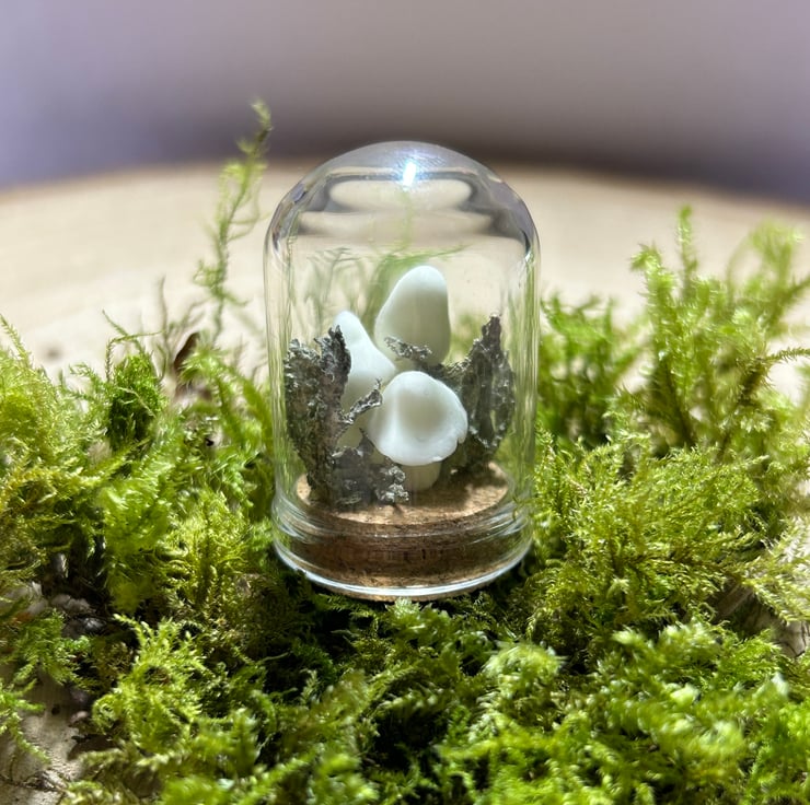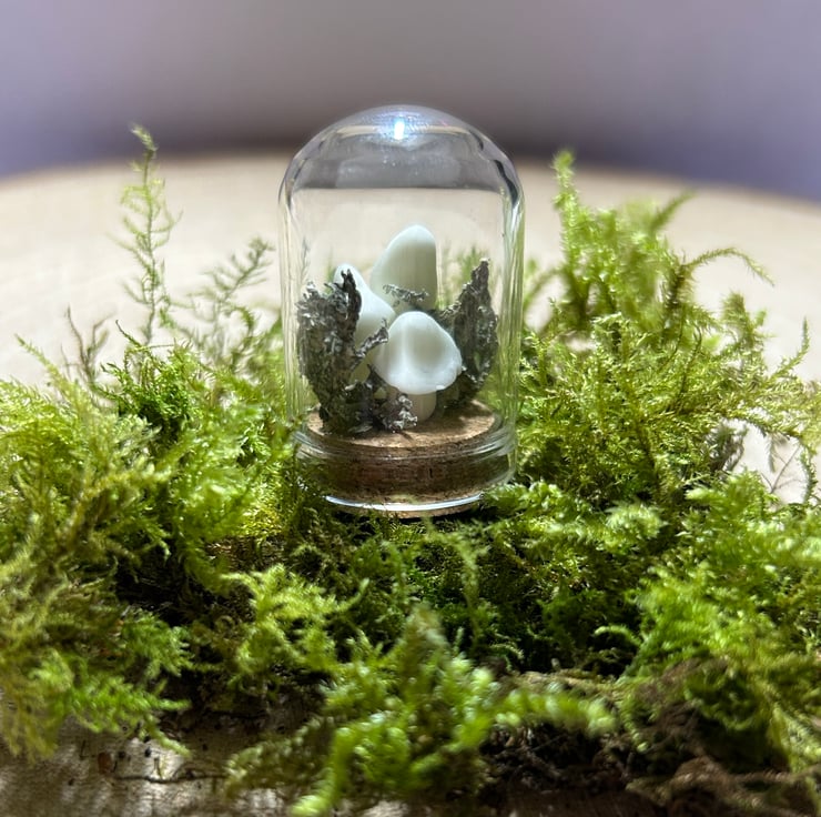 A glass dome featuring a tiny forest scene, including tiny mushrooms made from glow-in-the-dark clay, and real dried lichen!