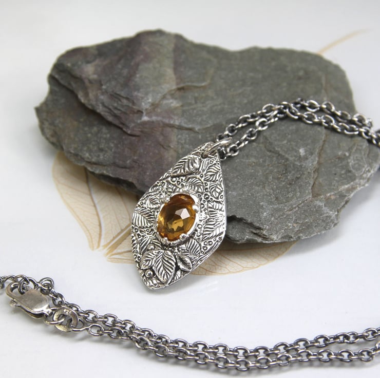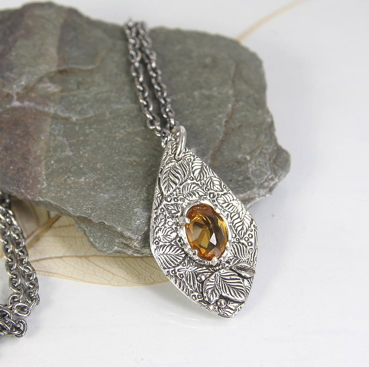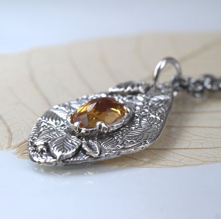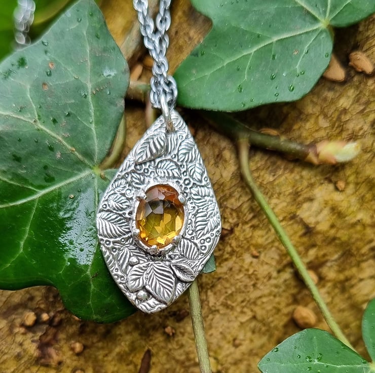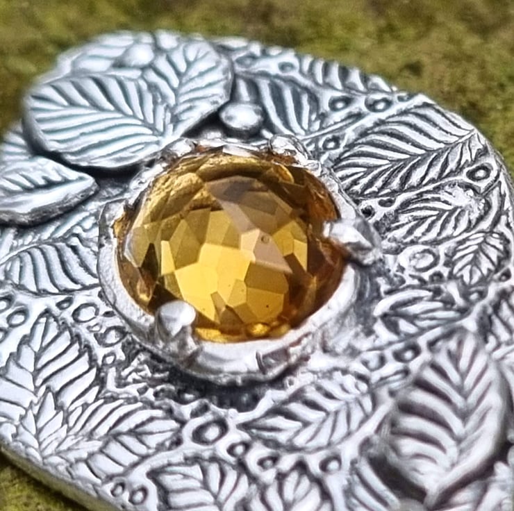 A gorgeous deep yellow citrine is set amongst the leaves and further leaves added framing the stone to give extra dimension.