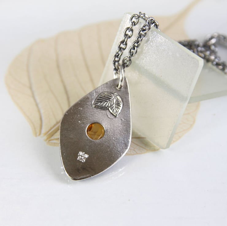 This little hand formed silver drop pendant has been impressed with a pattern of scattered leaves.