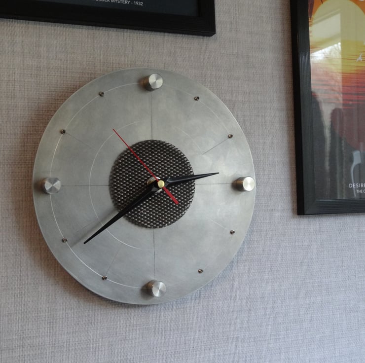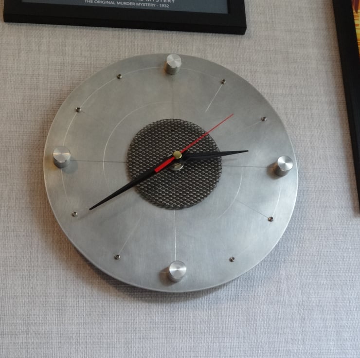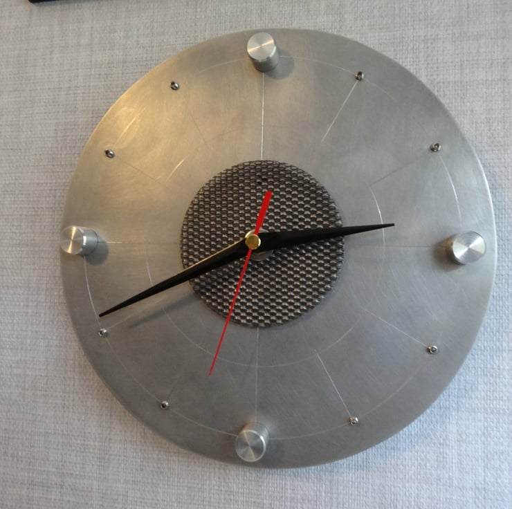 This unique clock is made by hand from 4mm aluminium. Ally fittings for 12, 3, 6 and 9 were turned up my lathe and bolted from the back. Stainless steel grub screws denote the other clock numbers.