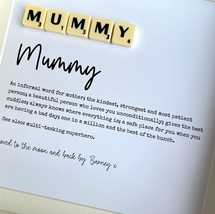 Spell out any name with the scrabble tiles, e.g. Mama, Mam etc at the top of the frame and then add your own personalised text to the bottom of the frame.
