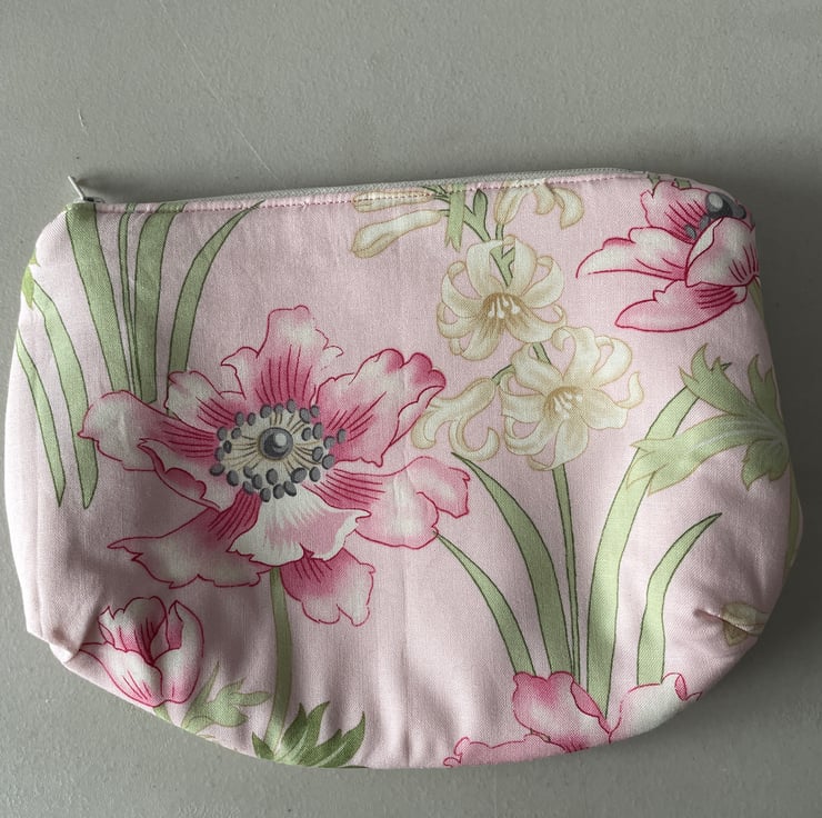 Handmade make up pouch with a zip fastening. Multi coloured floral fabric with a white zip and plain pink lining.