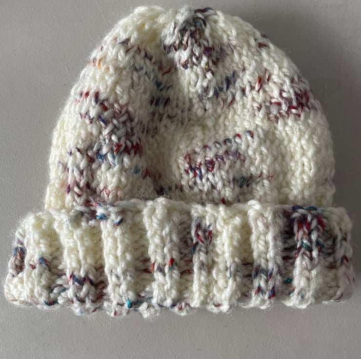 Handknitted cream and multi coloured beanie hat. Adult size. Knitted in chunky wool.